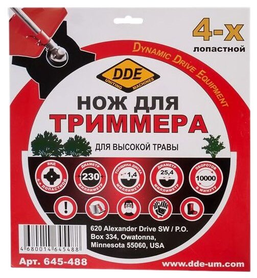 | Подробная комплектация | Нож для триммера DDE 4-хлопастной, 230 х 25,4 мм (толщина 1,4 мм), кольцо переходное на 20мм |