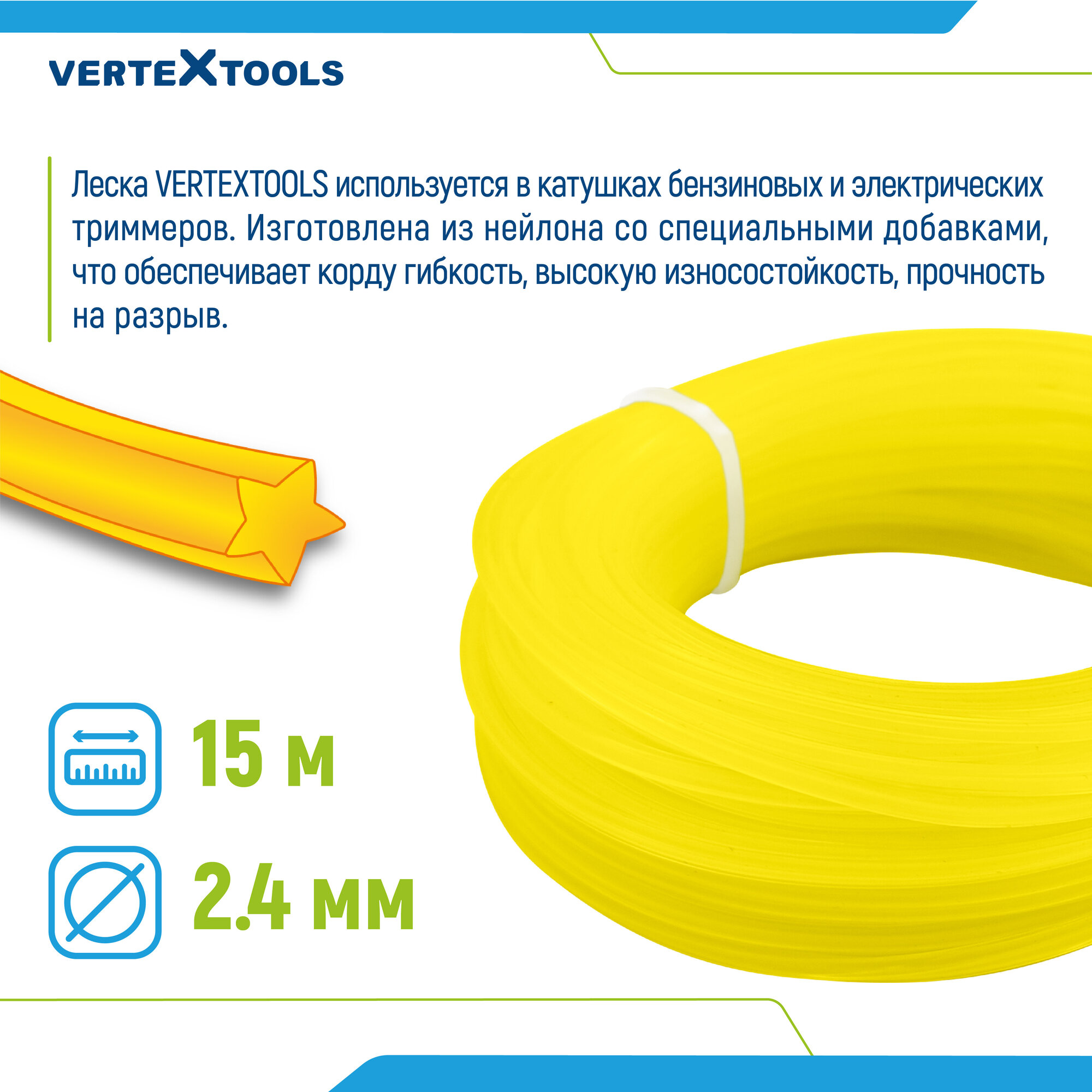 Леска для триммера VertexTools 2,4 мм 15 метров звездочка, прочный нейлон информация: