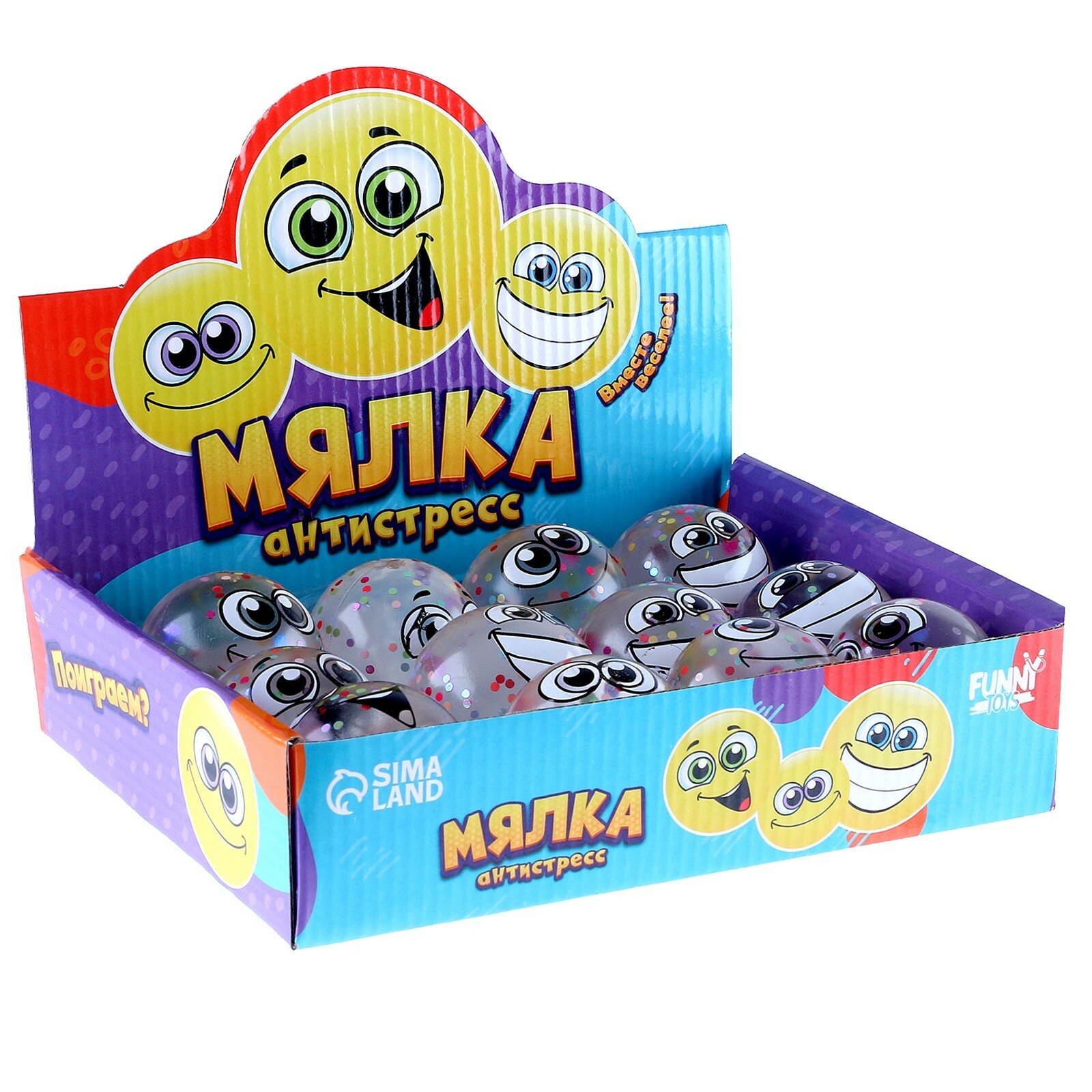 Мялка-антистресс "Смайлики" блестки, микс, с жидкостью, в шоубоксе, Сима-ленд информация: