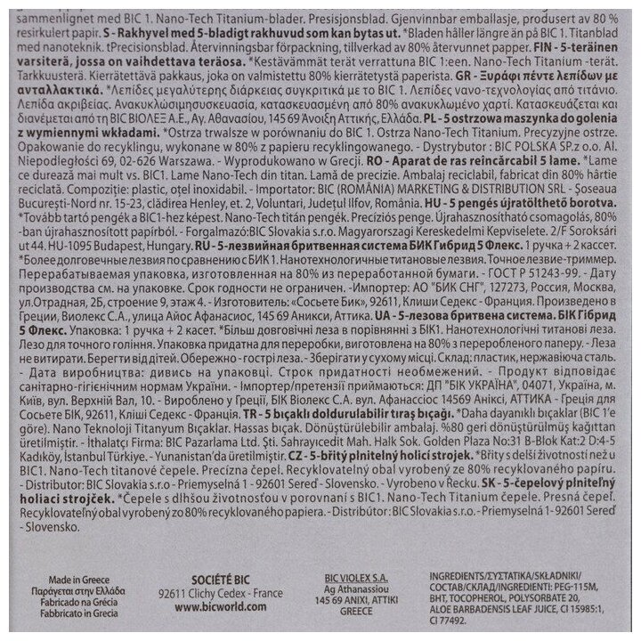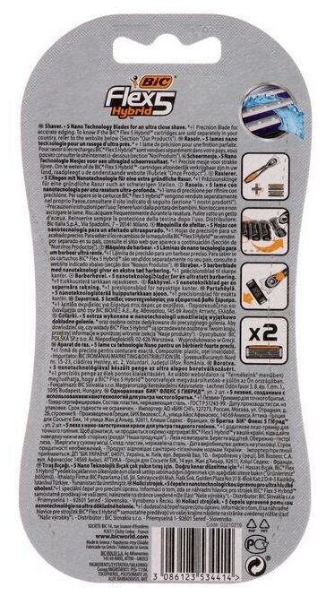 | Дополнительная информация | BIC Hybrid 5 Flex - это мужская бритвенная система, где 5 подвижных нанотехнологичных лезвий, индивидуально подстраиваются под контуры лица для тщательного и гладкого бритья. Каждая кассета оснащена специальной увлажняющей полоской на плавающей головке. Бритва изготовлена в Европе на заводах BIC и проходит более 25 тестов контроля качества. |