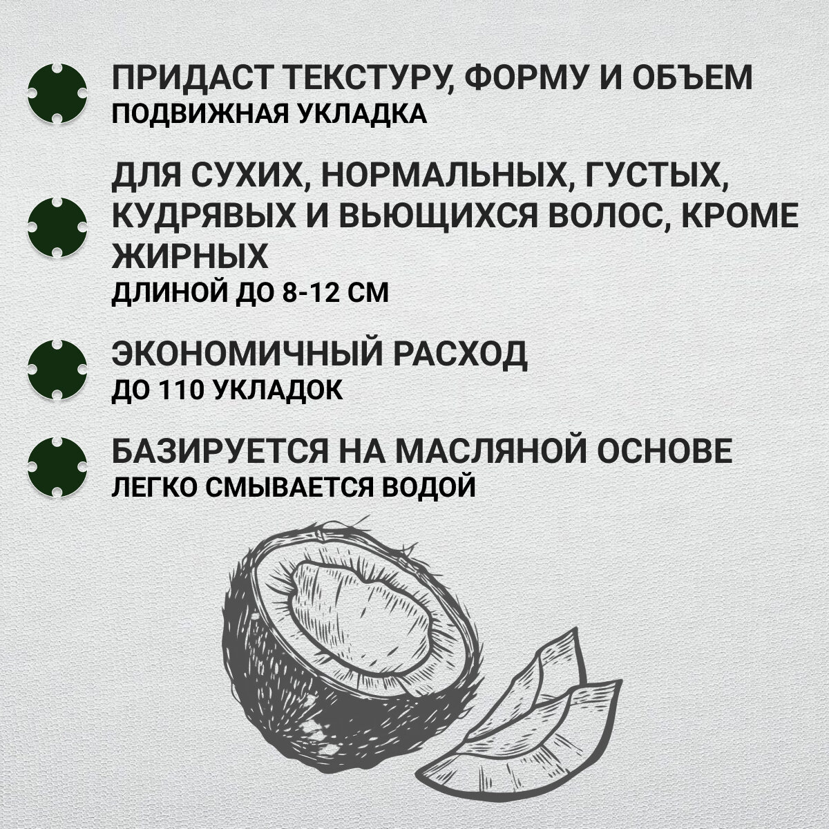 | Способ применения | возьмите небольшое количество продукта размером с горошину, равномерно разотрите средство по ладоням до теплоты и полного распределения, нанесите средство на сухие или влажные волосы от корней до кончиков задайте укладке желаемую форму с помощью расчёски, поправьте укладку в течение дня, если вы носите головной убор |