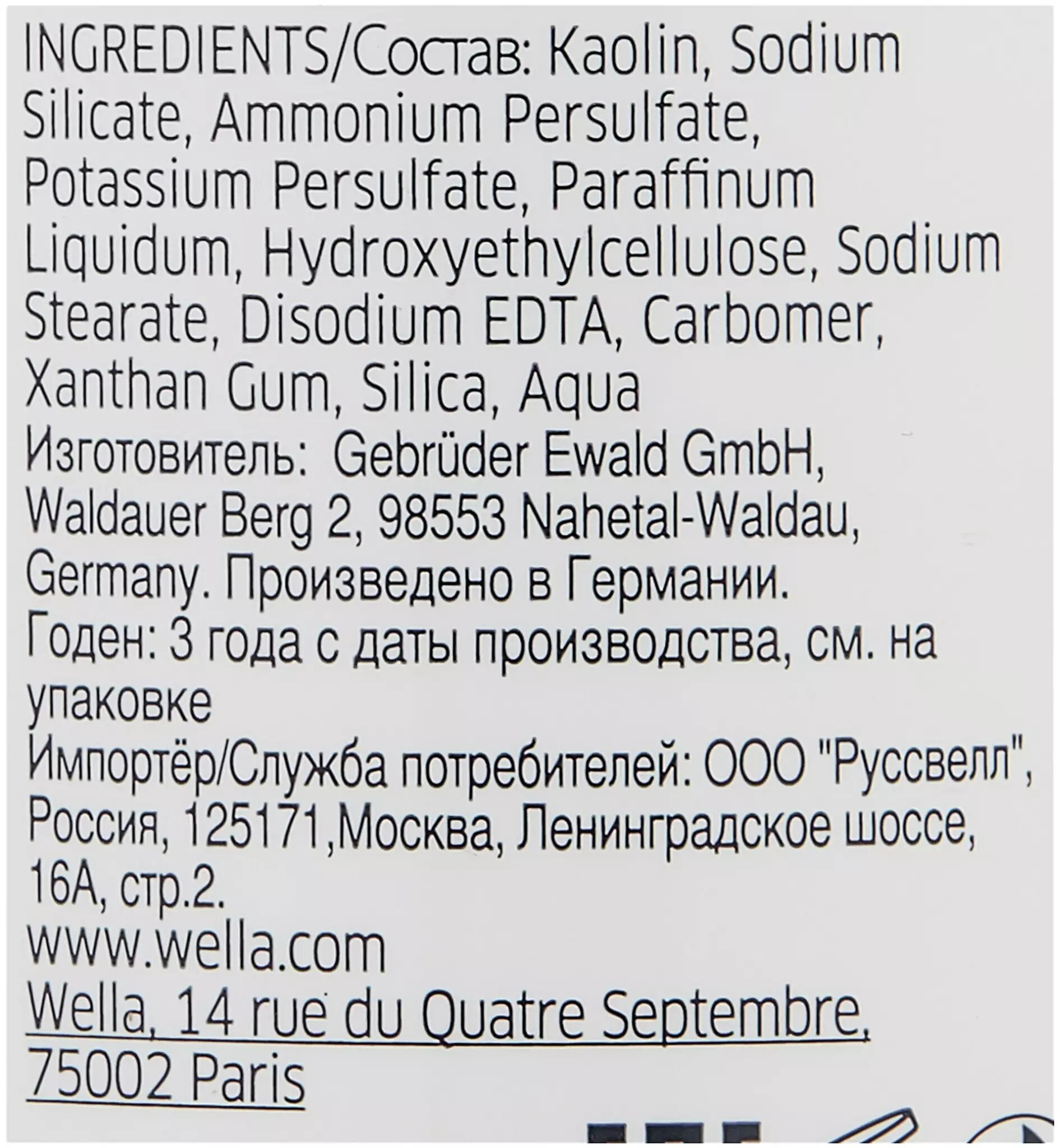 | Состав | kaolin, sodium silicate, ammonium persulfate, potassium persulfate, paraffinum liquidum, hydroxyethylcellulose, sodium stearate, disodium EDTA, carbomer, xanthan gum, silica, aqua |