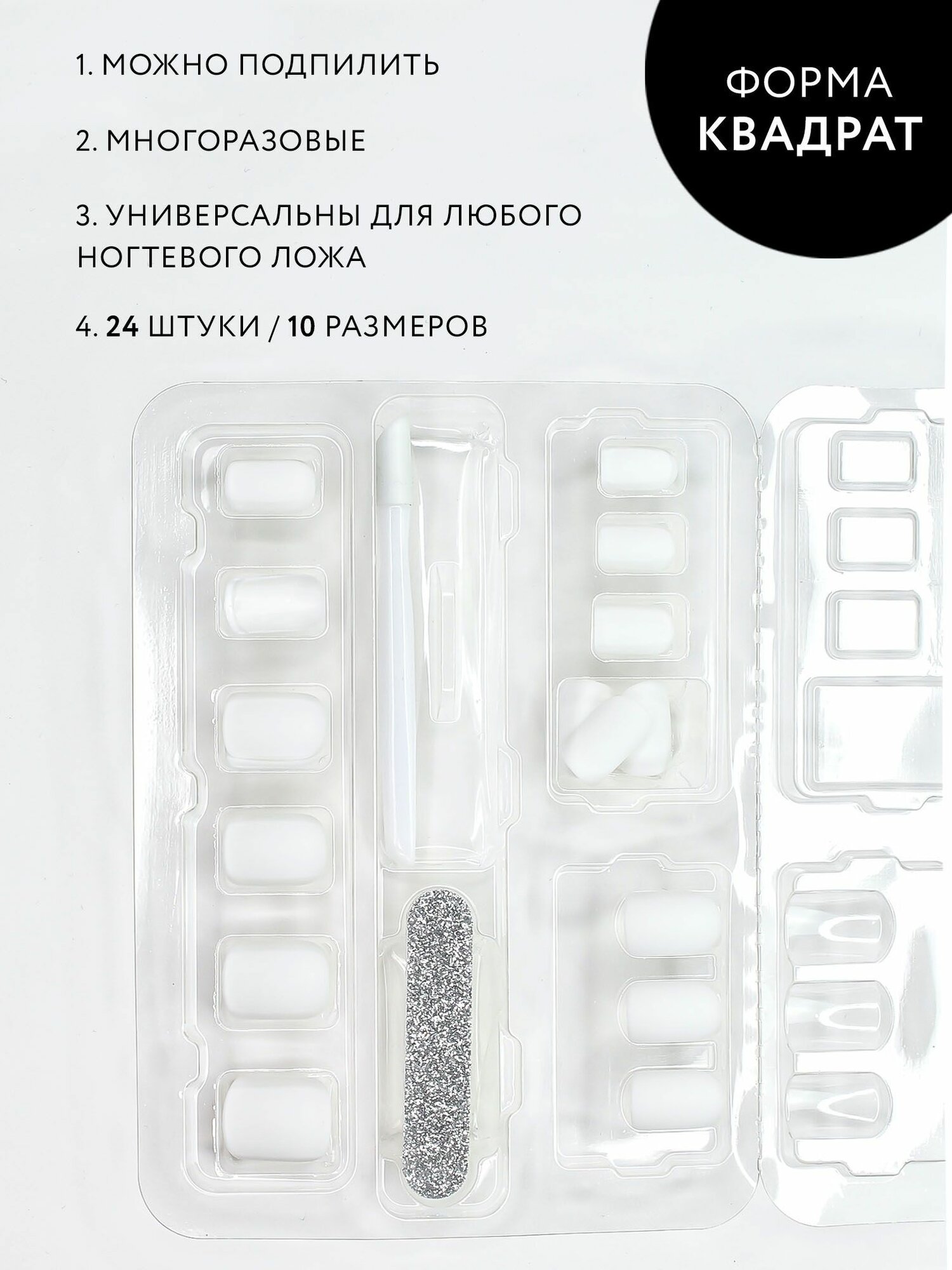 | Дополнительная информация | Чтобы использовать ногти повторно примени клеевые стикеры (24 шт); один раз для сверхсильной фиксации - клей ( можно приобрести в каталоге нашего магазина ) |