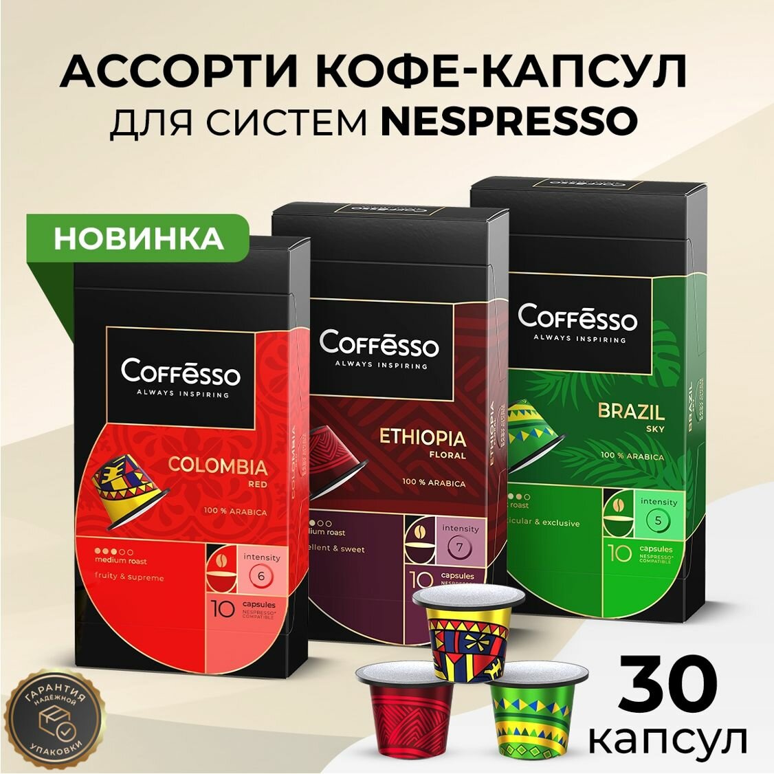 10 цен на Кофе в капсулах Nespresso Coffesso Brazil, Colombia, Etfiopia ассорти набор 3 упаковки x10шт