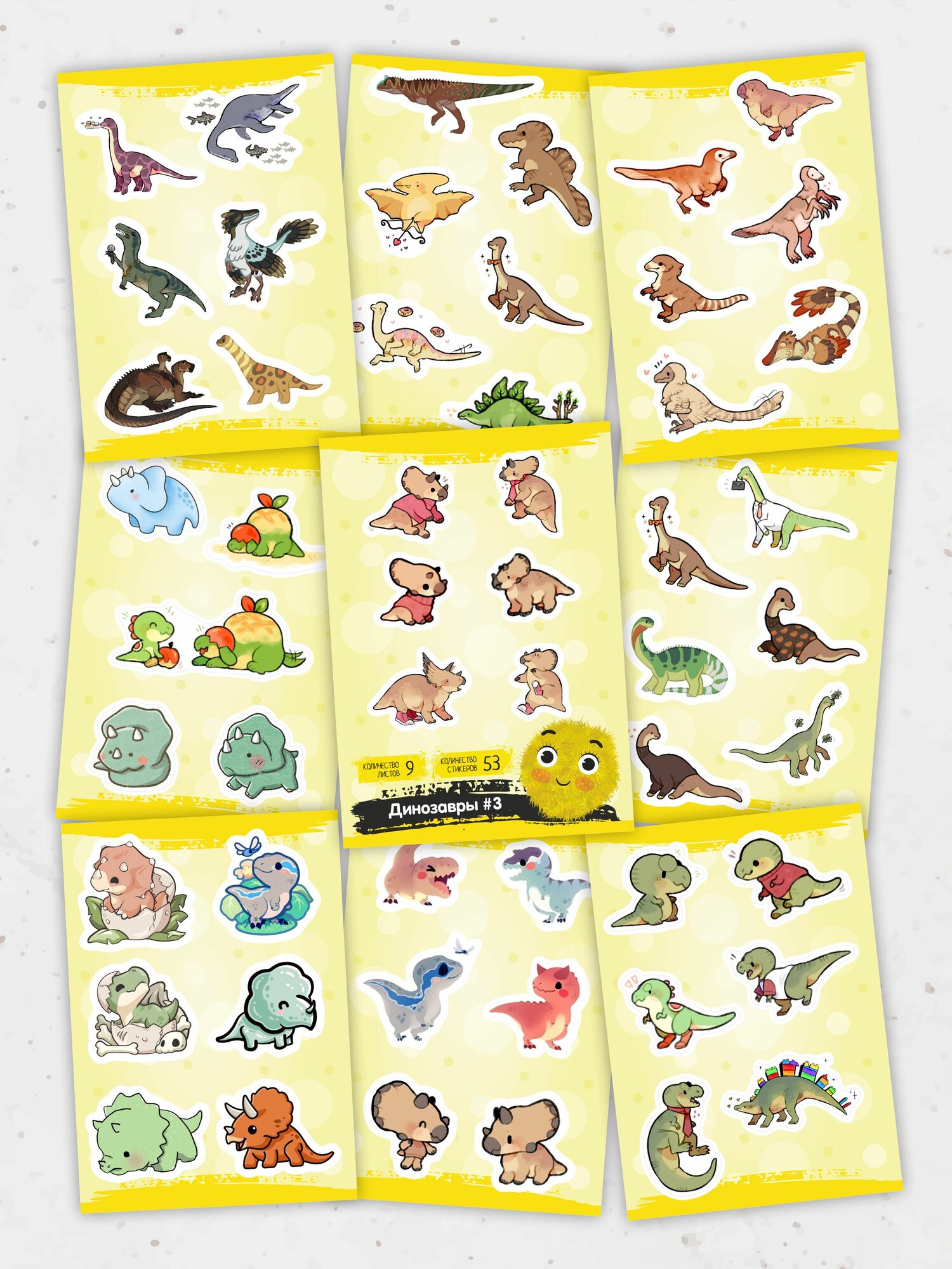 Наклейки для детей "Kawaii Динозавры #3", 53 шт., 9 листов А6. Стикеры на телефон, ноутбук, чехол, аниме, на стену. Набор для творчества и декора, BulbaCraft