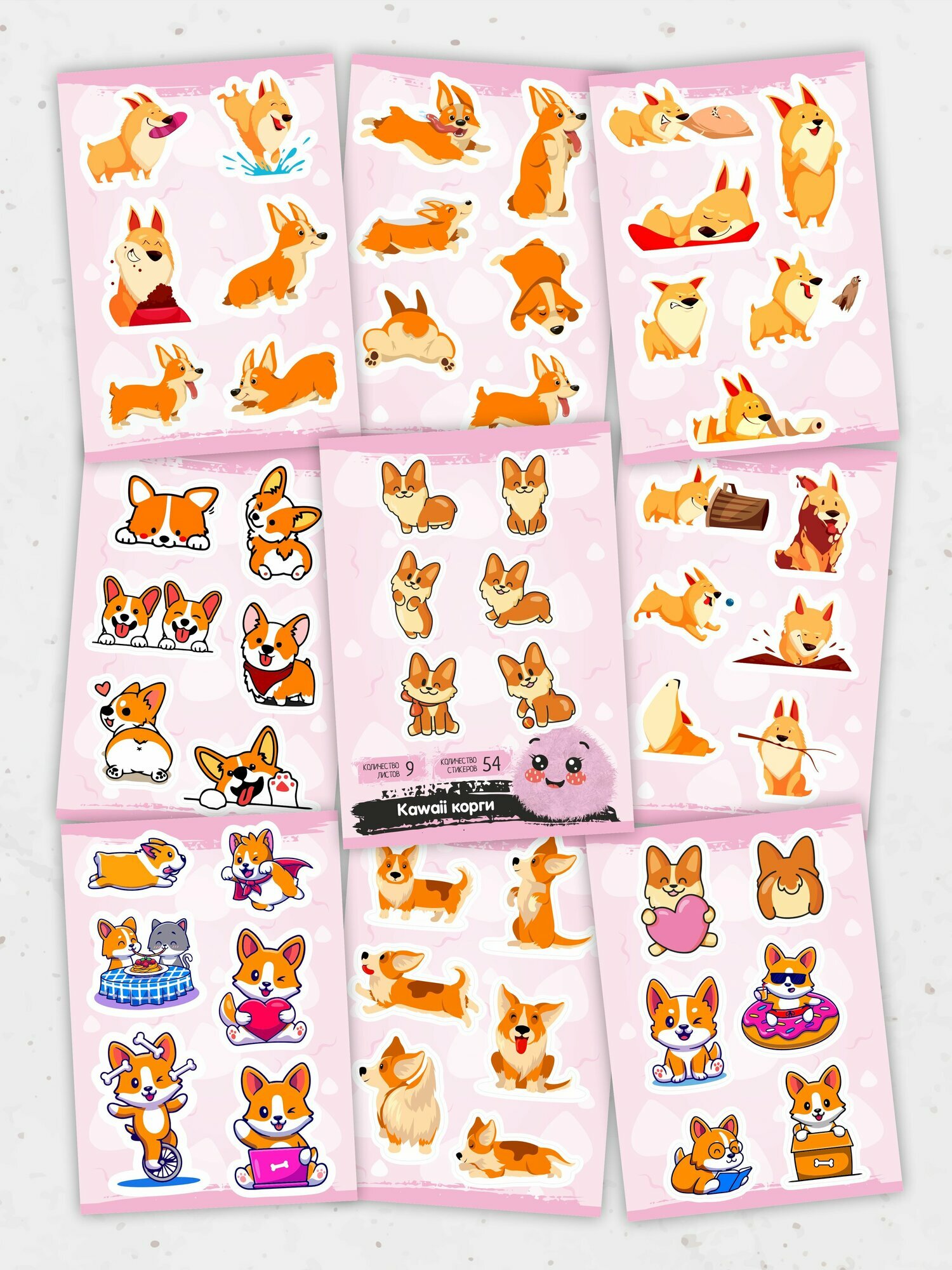 10 цен на Наклейки стикеры милые "Кавайи корги", 54 шт, 9 листов А6. Для детей. Набор наклеек для декора, на телефон, чехол, ноутбук. BulbaCraft