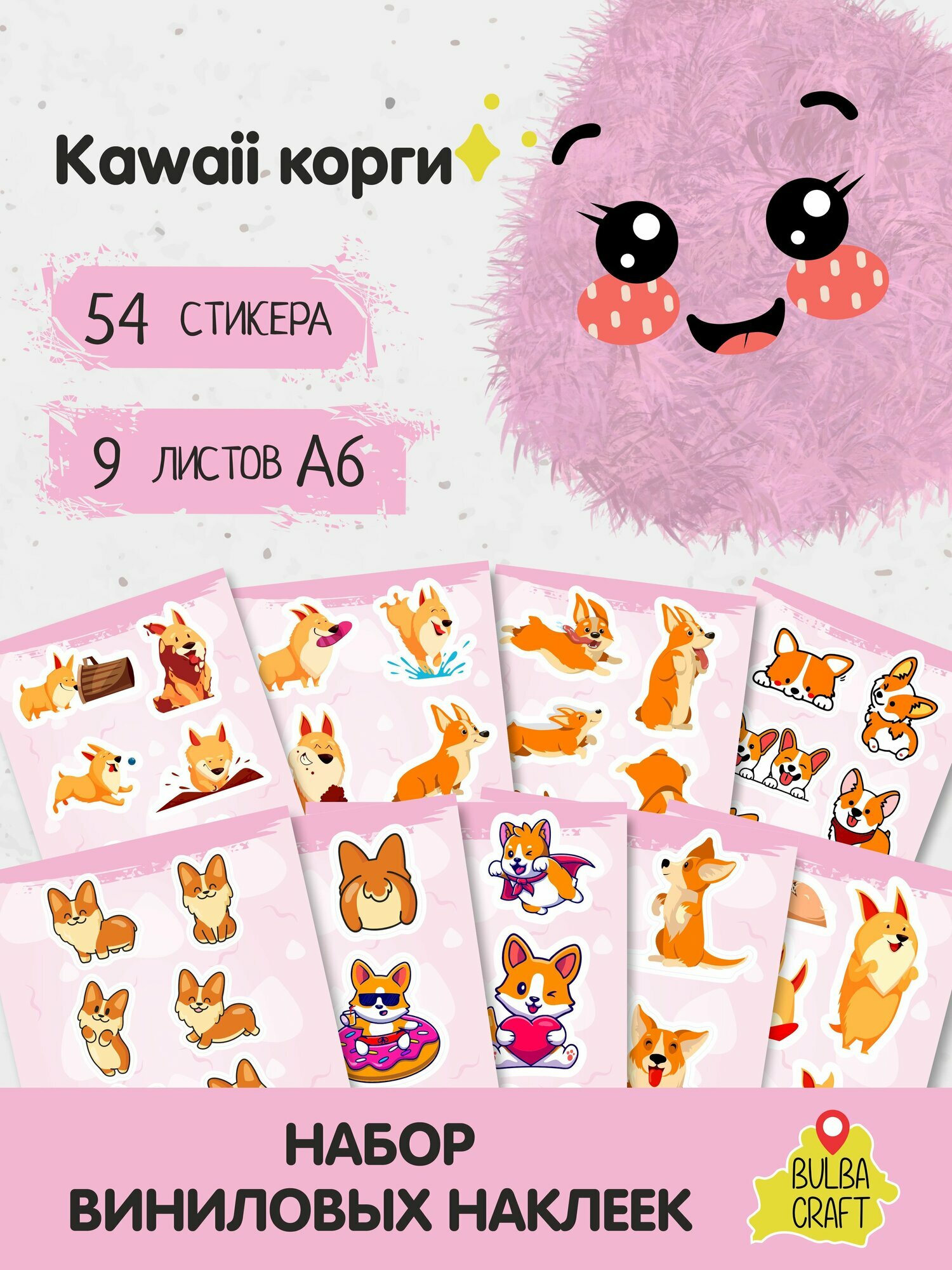 Наклейки стикеры милые "Кавайи корги", 54 шт, 9 листов А6. Для детей. Набор наклеек для декора, на телефон, чехол, ноутбук. BulbaCraft информация: