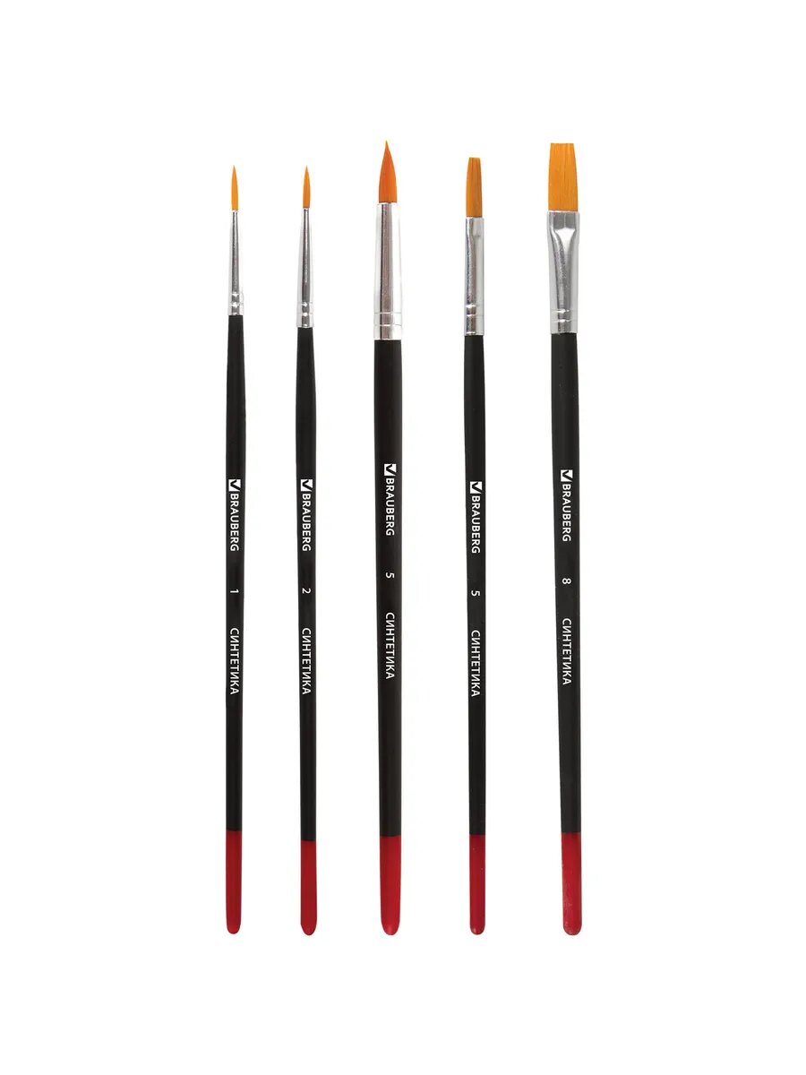 Кисти / кисточки для акварели, гуаши для рисования Brauberg, набор 5 штуки (синтетика, круглые № 1, 2, 5, плоские № 5, 8), 200219