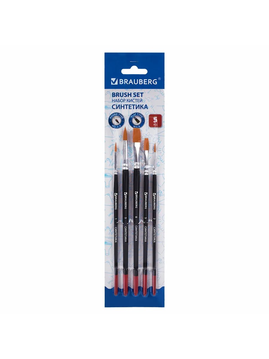 Кисти / кисточки для акварели, гуаши для рисования Brauberg, набор 5 штук (синтетика, круглые № 1, 2, 5, плоские № 5, 8), блистер, 200219 209 ₽