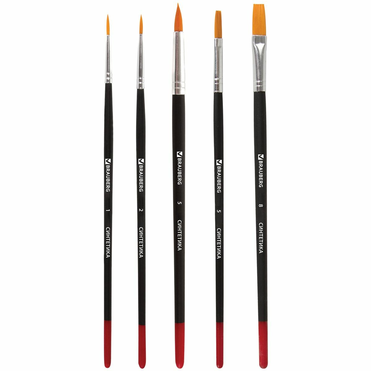 Кисти / кисточки для акварели, гуаши для рисования Brauberg, набор 5 штуки (синтетика, круглые № 1, 2, 5, плоские № 5, 8), 200219