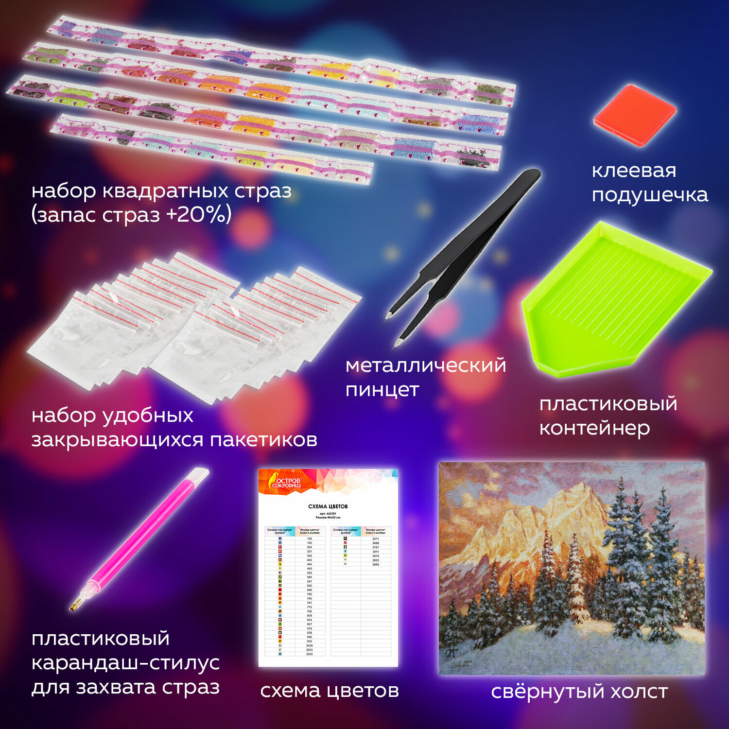 | Комплектация | холст, стразы, контейнер, стилус, клеевой квадрат, пинцет, схема |