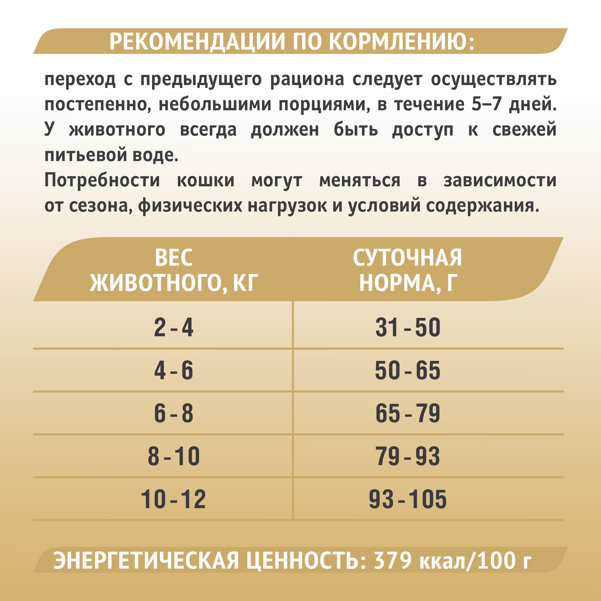 | Дополнительная информация | Переход с предыдущего рациона следует осуществлять постепенно, небольшими порциями в течение 5-7 дней. У животного всегда должен быть доступ к свежей питьевой воде. |