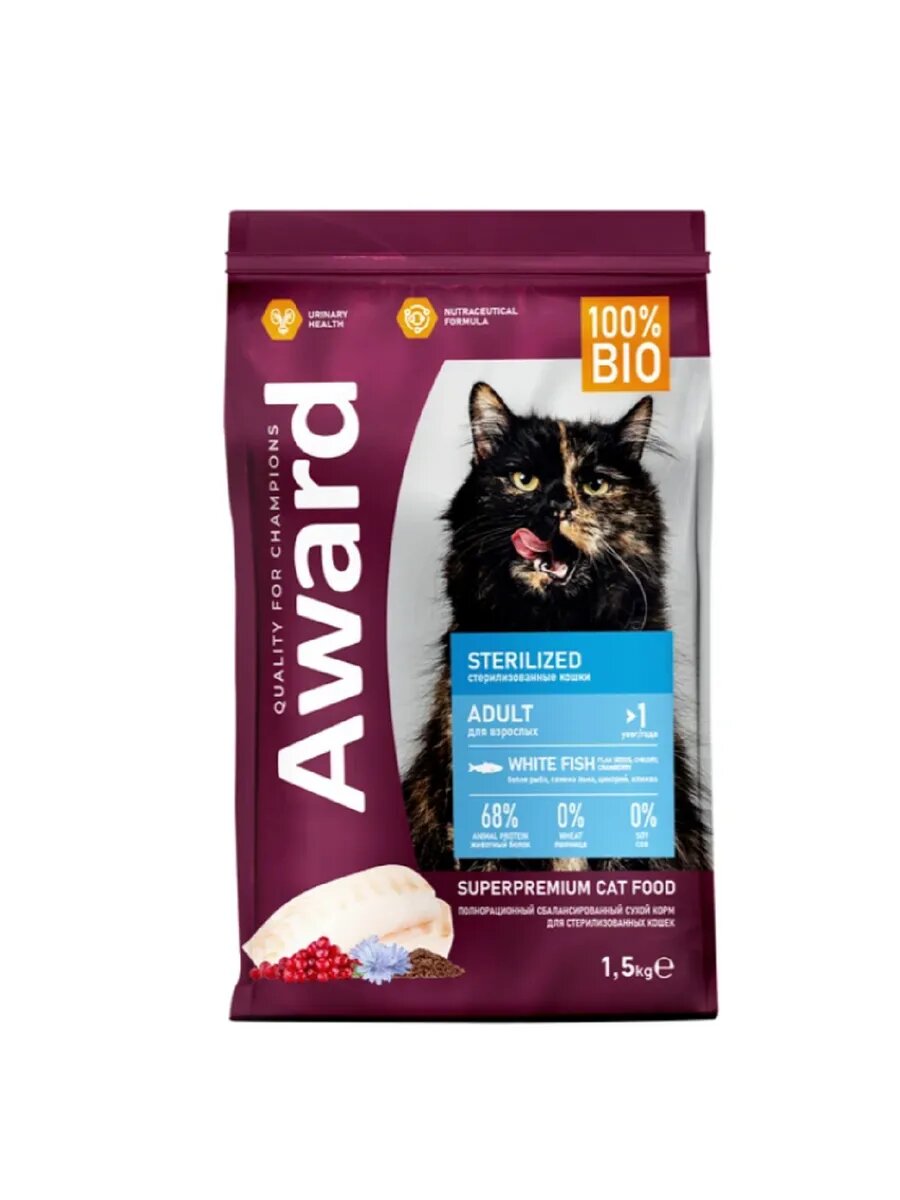 AWARD Sterilized Сухой корм для взрослых стерилизованных кошек с белой рыбой с добавлением семян льна, клюквы и цикория 1.5кг 1 140 ₽