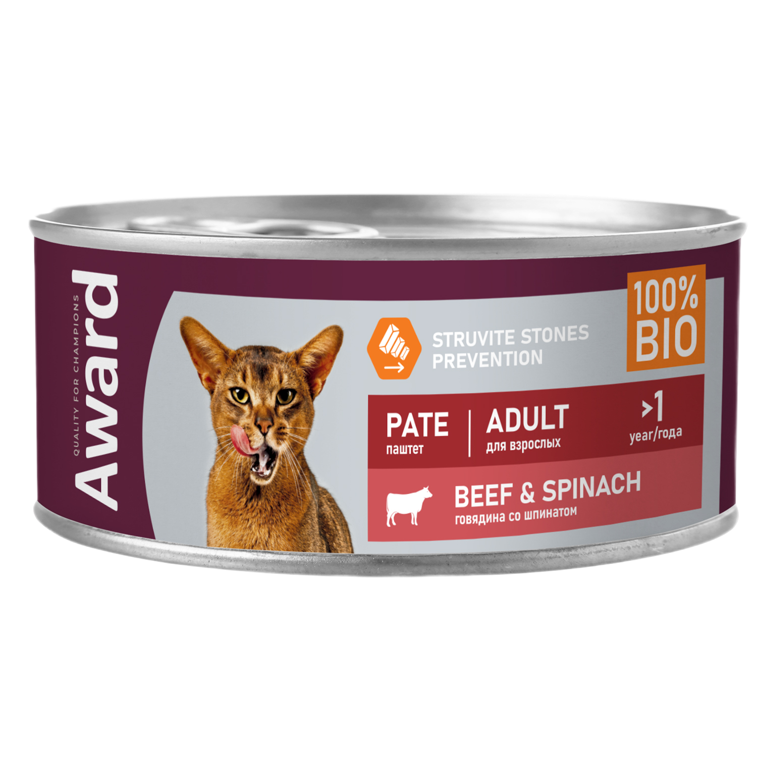 Влажный корм AWARD для взрослых кошек паштет из говядины со шпинатом (100гр х 16шт) информация:
