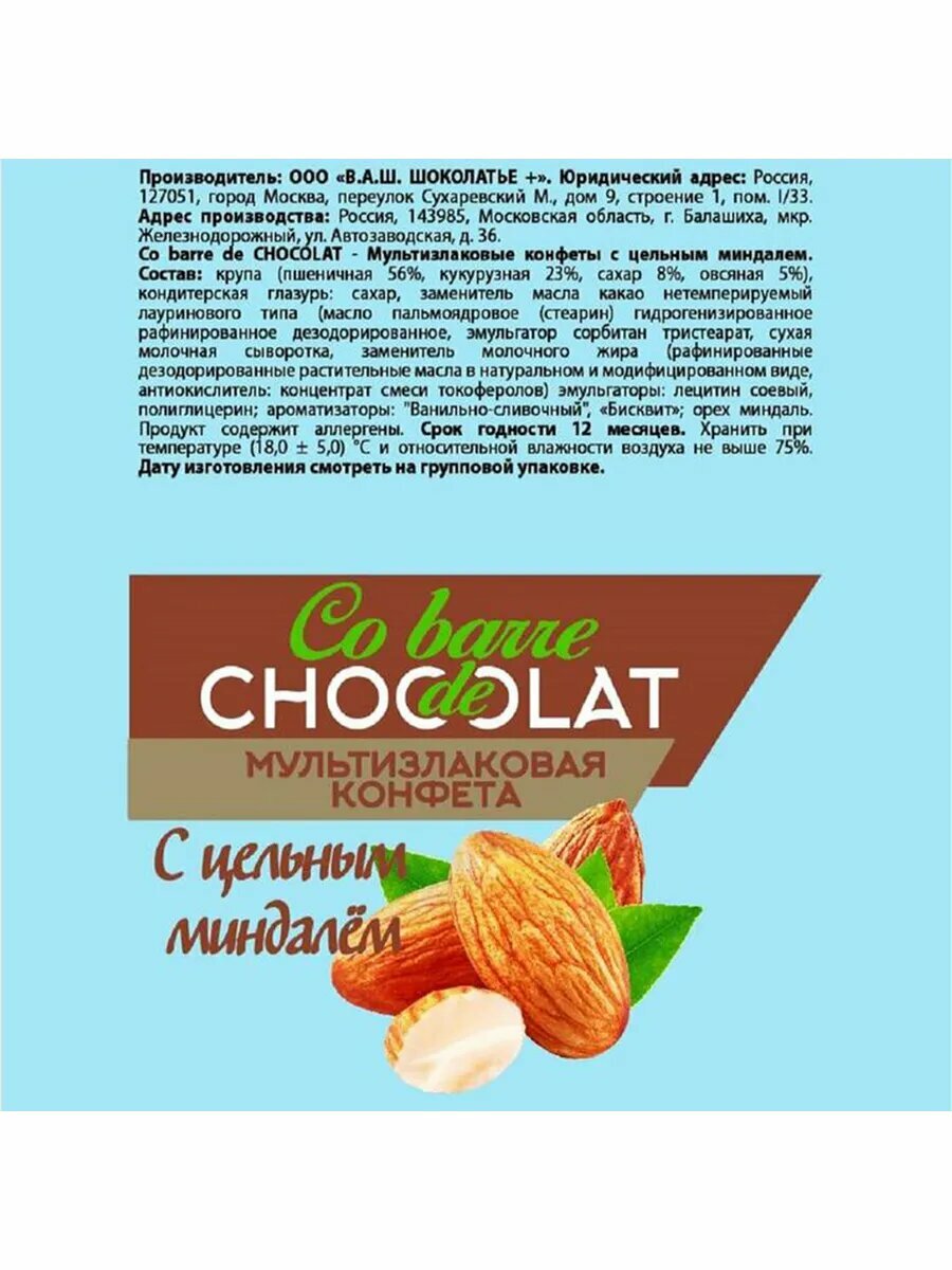 Мультизлаковая конфета Co barre de Chocolat с цельным миндалем,500гр