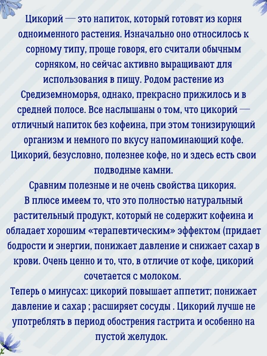 | Способ приготовления | положить 1-2 чайные ложки цикория в чашку. Залить кипятком и перемешать. Сахар, молоко или сливки добавлять по вкусу. |