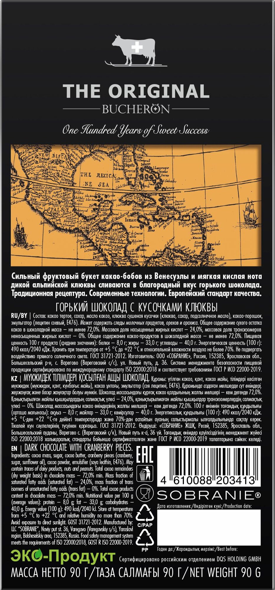 Шоколад горький BUCHERON THE ORIGINAL с кусочками клюквы 90г