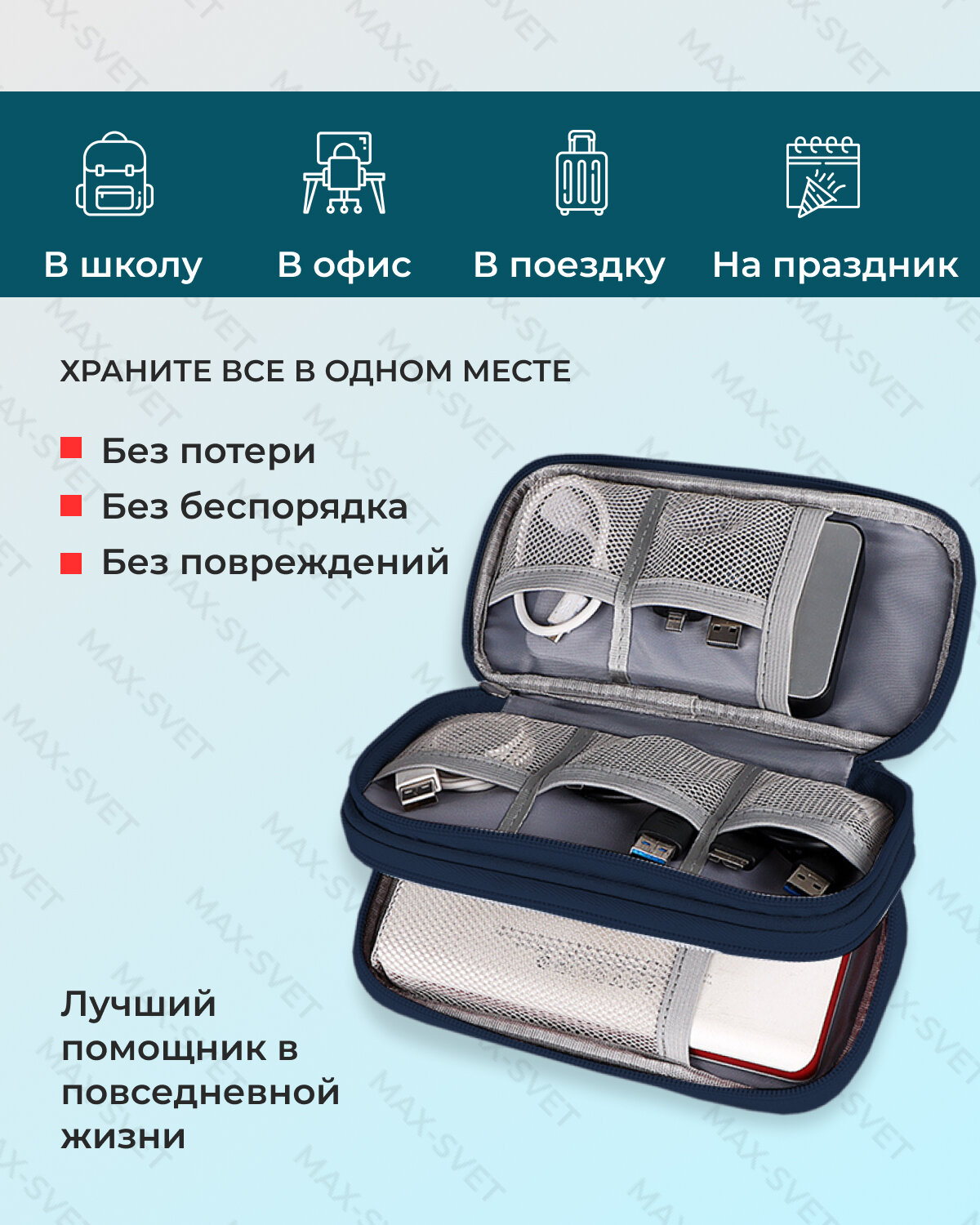 Мы выбрали 10 лучших цен на Сумка органайзер для проводов, зарядок, аксессуаров, цвет темно-синий (MAXSVETSHOP). Перед тем как купить Сумка органайзер для проводов, зарядок, аксессуаров, цвет темно-синий (MAXSVETSHOP) посмотрите найденные предложения из Яндекс Маркета и других сайтов на основе XML фидов.