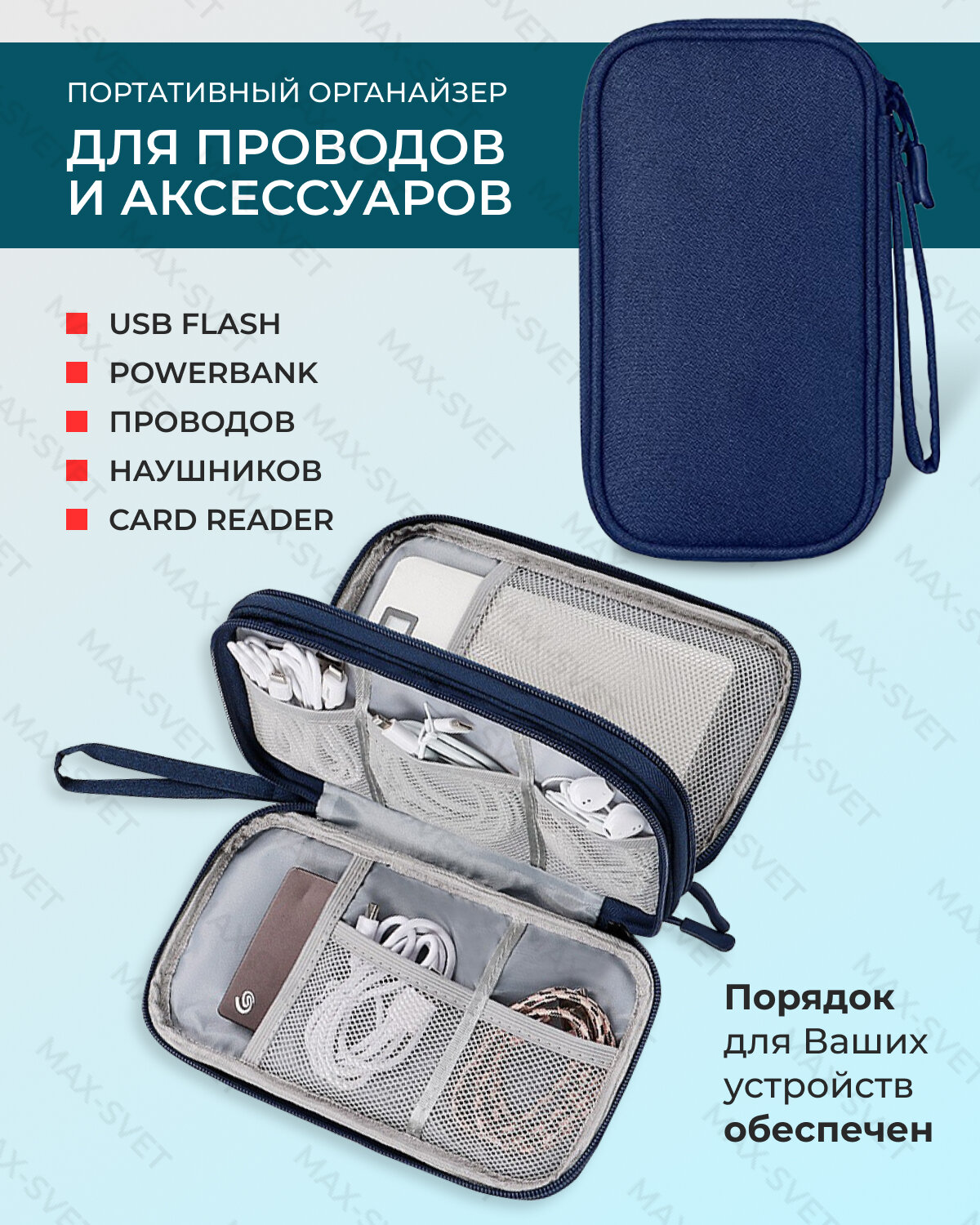 Сумка органайзер для проводов, зарядок, аксессуаров, цвет темно-синий (MAXSVETSHOP) информация: