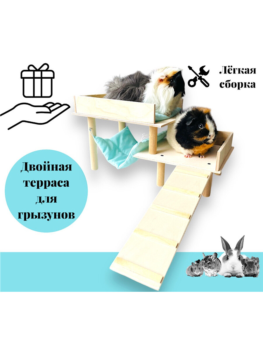 Домик-терраса CALEVI для грызунов, морской свинки с гамаком и подушкой, дерево информация: