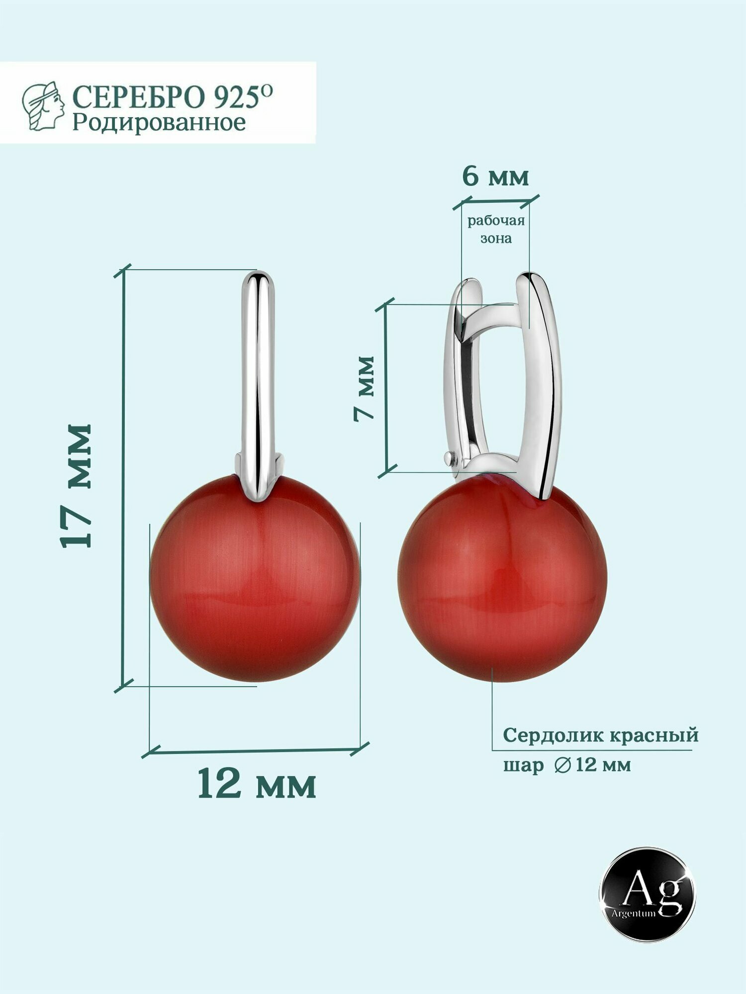 Серьги двусторонние Argentum, серебро, 925 проба, родирование, сердолик, размер 12 мм, длина 1.7 см, , бордовый информация: