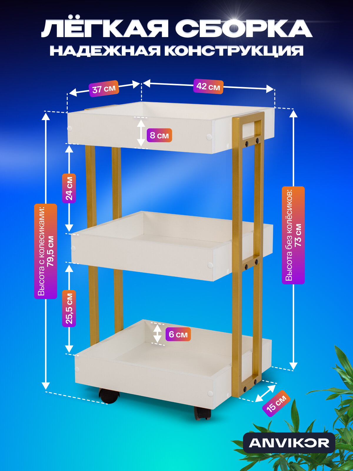 Тележка косметологическая трехъярусная с бортиками на колесиках лофт Ангара золотая информация: