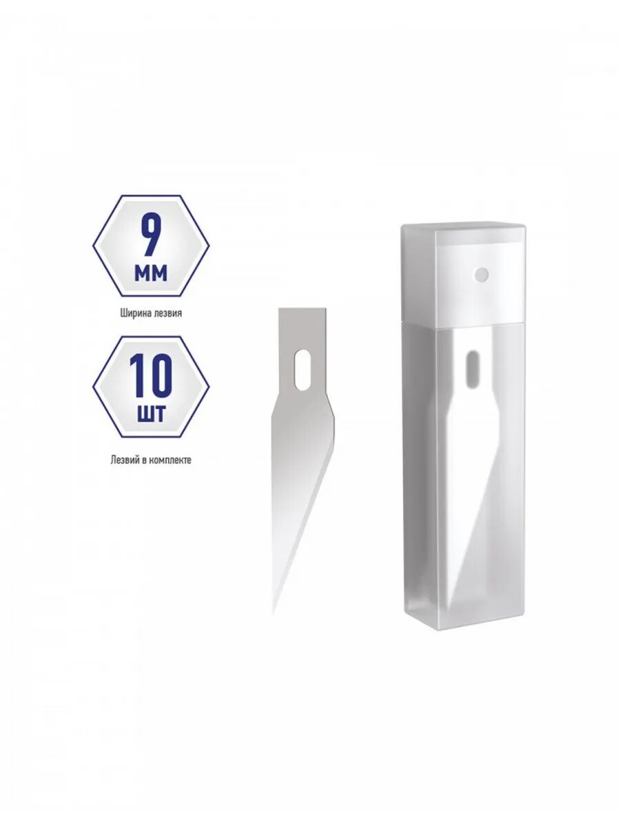 | Подробная комплектация | Лезвия для канцелярских ножей 10 штук в пластиковом пенале |