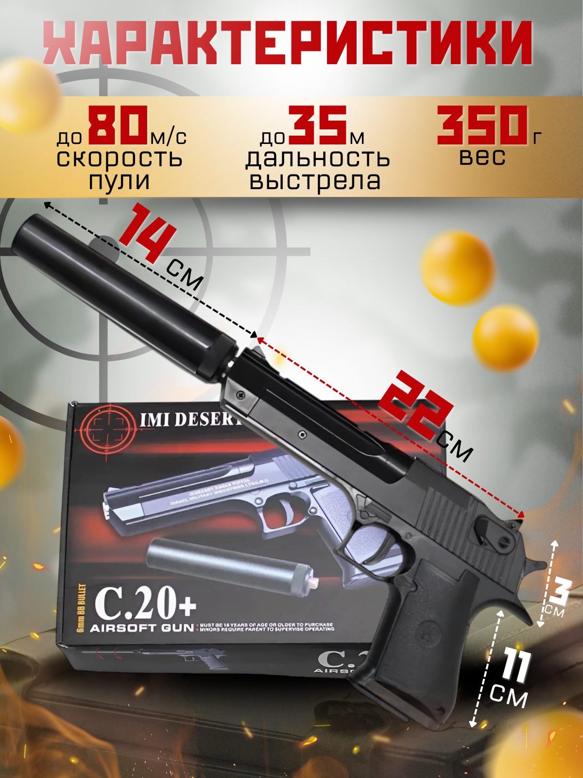 Пистолет металлический детский с глушителем Desert Eagle "Черный орел" C20+ (500 пулек в комплекте) информация: