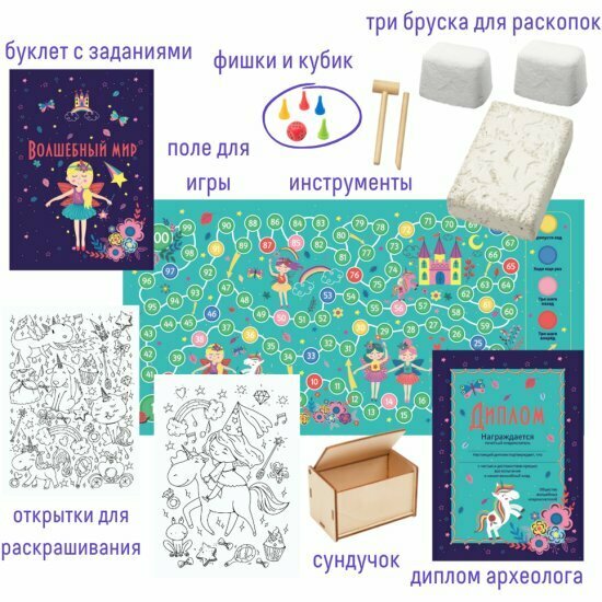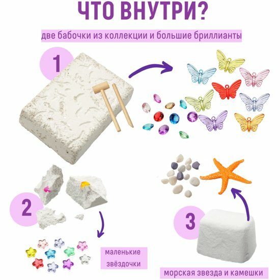 | Комплектация | деревянный молоточек, деревянный стек для дробления, окаменелый грунт, артефакты (россыпь разноцветных находок из пластика), мешочек для находок |