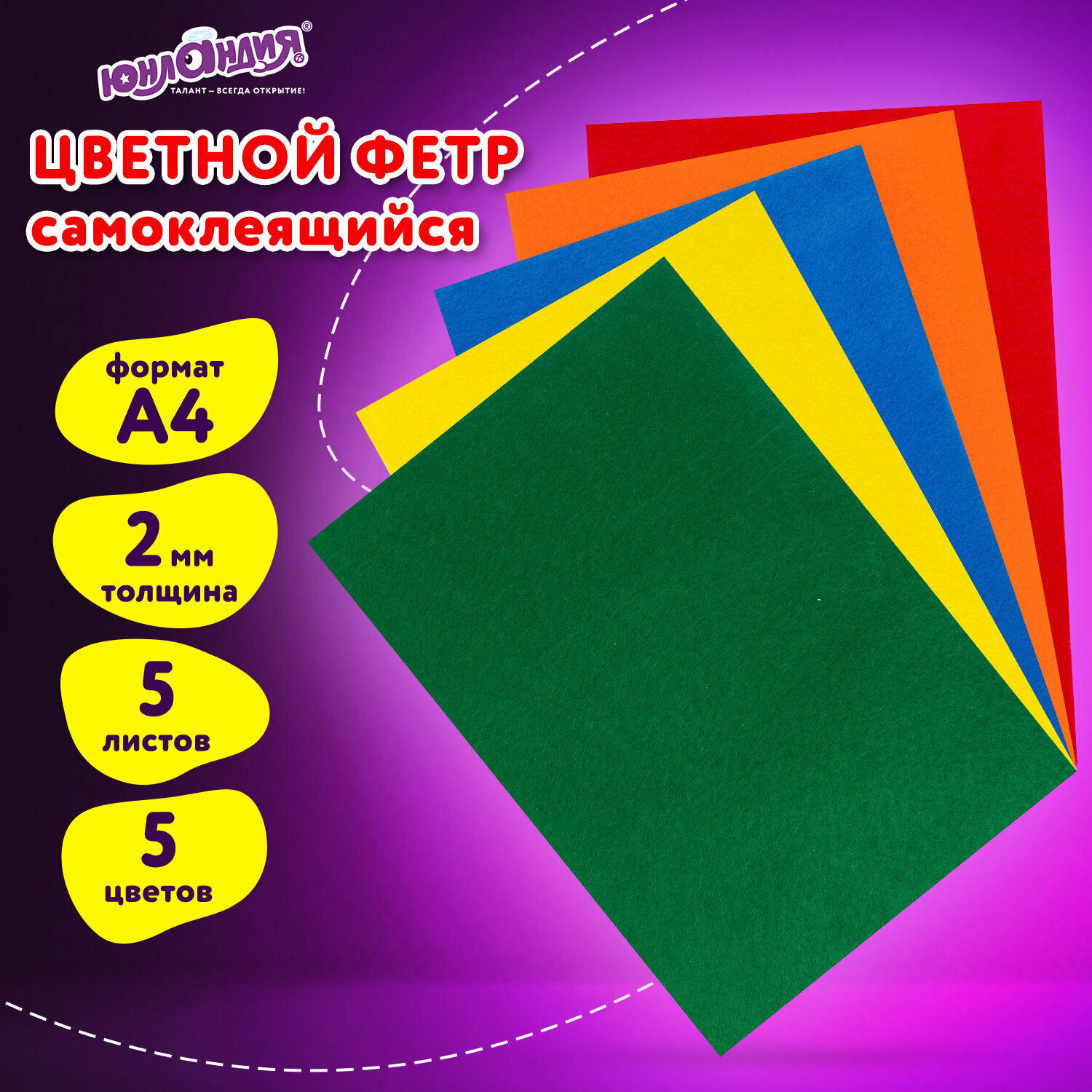 | Комплектация | Цветной фетр для творчества А4 ЮНЛАНДИЯ САМОКЛЕЯЩИЙСЯ, 5 ЯРКИХ ЦВЕТОВ, с европодвесом, 662051 |