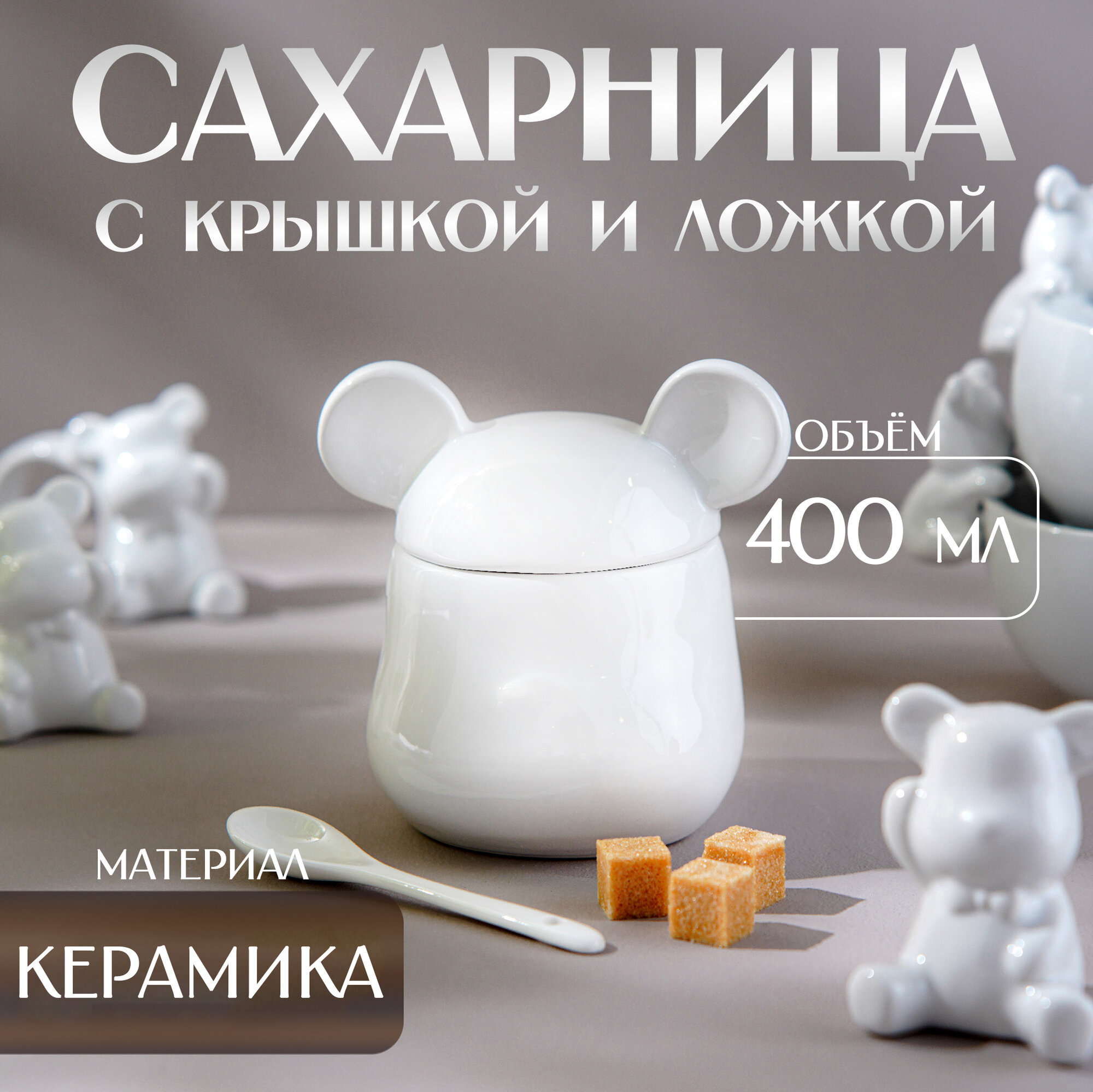 10 цен на Сахарница керамическая для сервировки стола, с крышкой и ложкой Доляна «Мишка Отто», 400 мл, 11×12×12,5 см, цвет белый