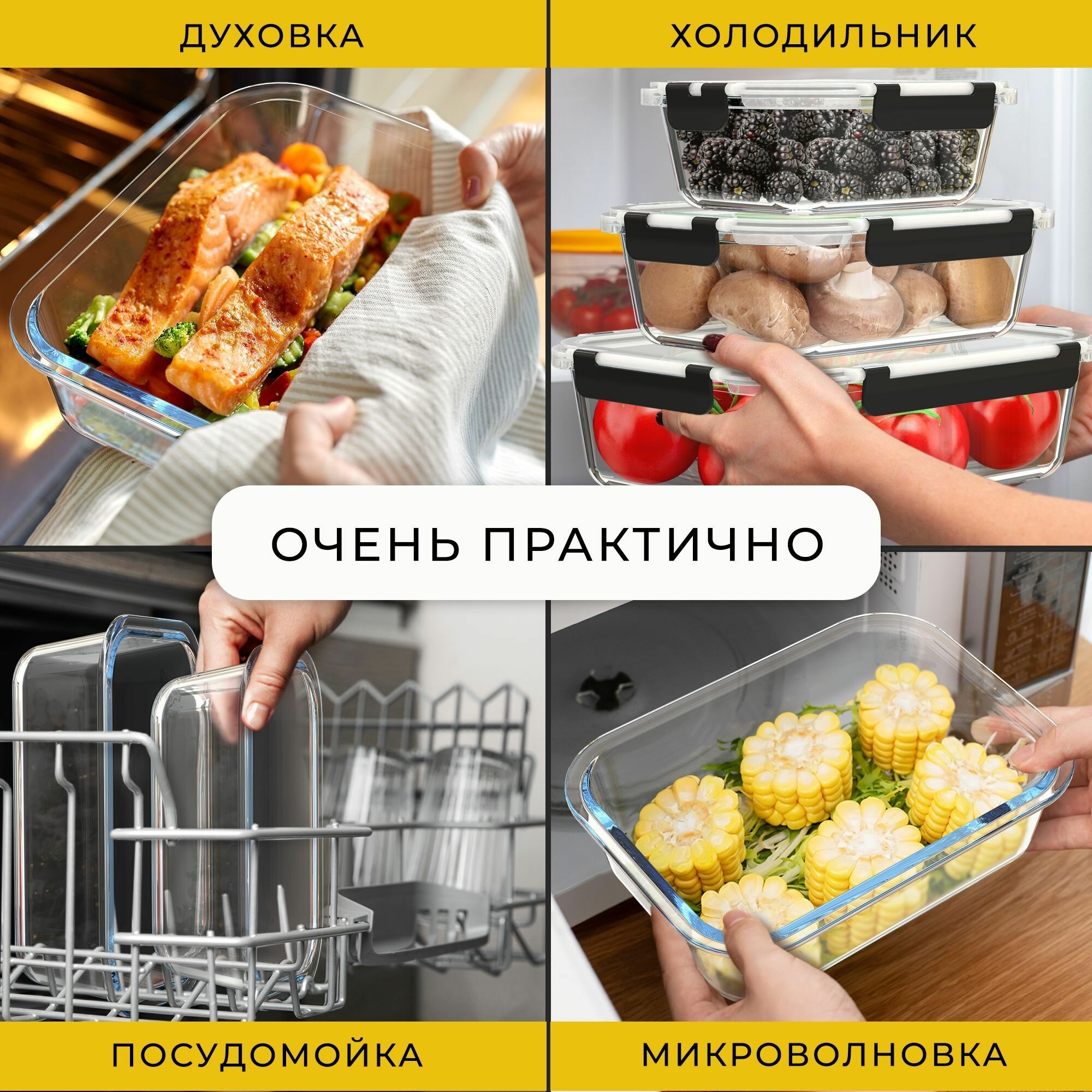 Отзывы на Контейнер для еды стеклянный, набор 8шт (прямоугольные 370мл+630мл+1040мл+1500мл, квадратные 310мл+800мл, круглые 400мл, 970мл), Homes Factor