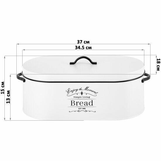 | Дополнительная информация | Хлебница "Белая" 34,5х18х15 см с крышкой, овальная, высота без крышки 13 см, размер с ручками 37х18х15 см, металл |
