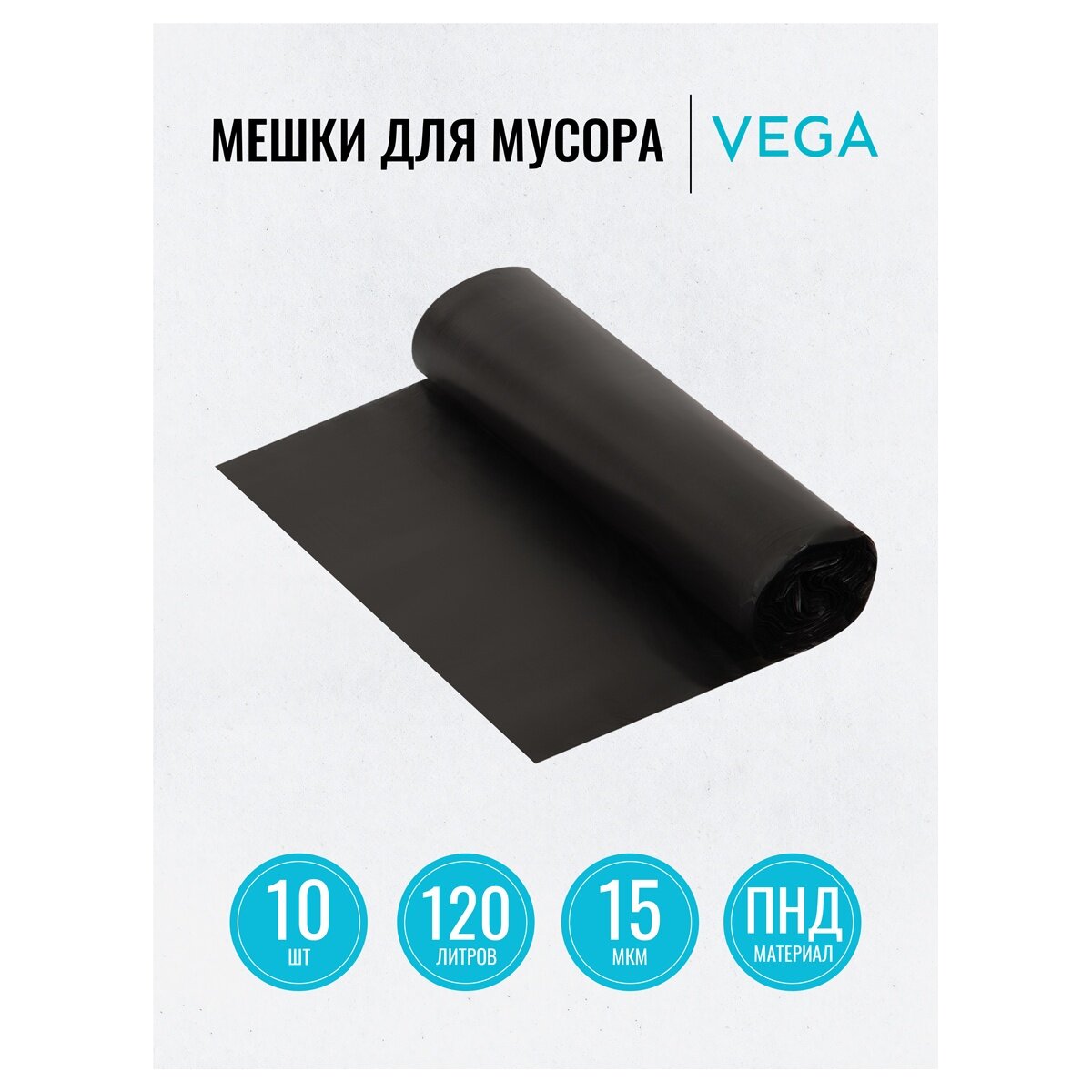 Мешки для мусора Vega 120 литров, ПНД, 70х110 см, 15 мкм, 10 шт, прочные, черные, в рулоне (344028) информация: