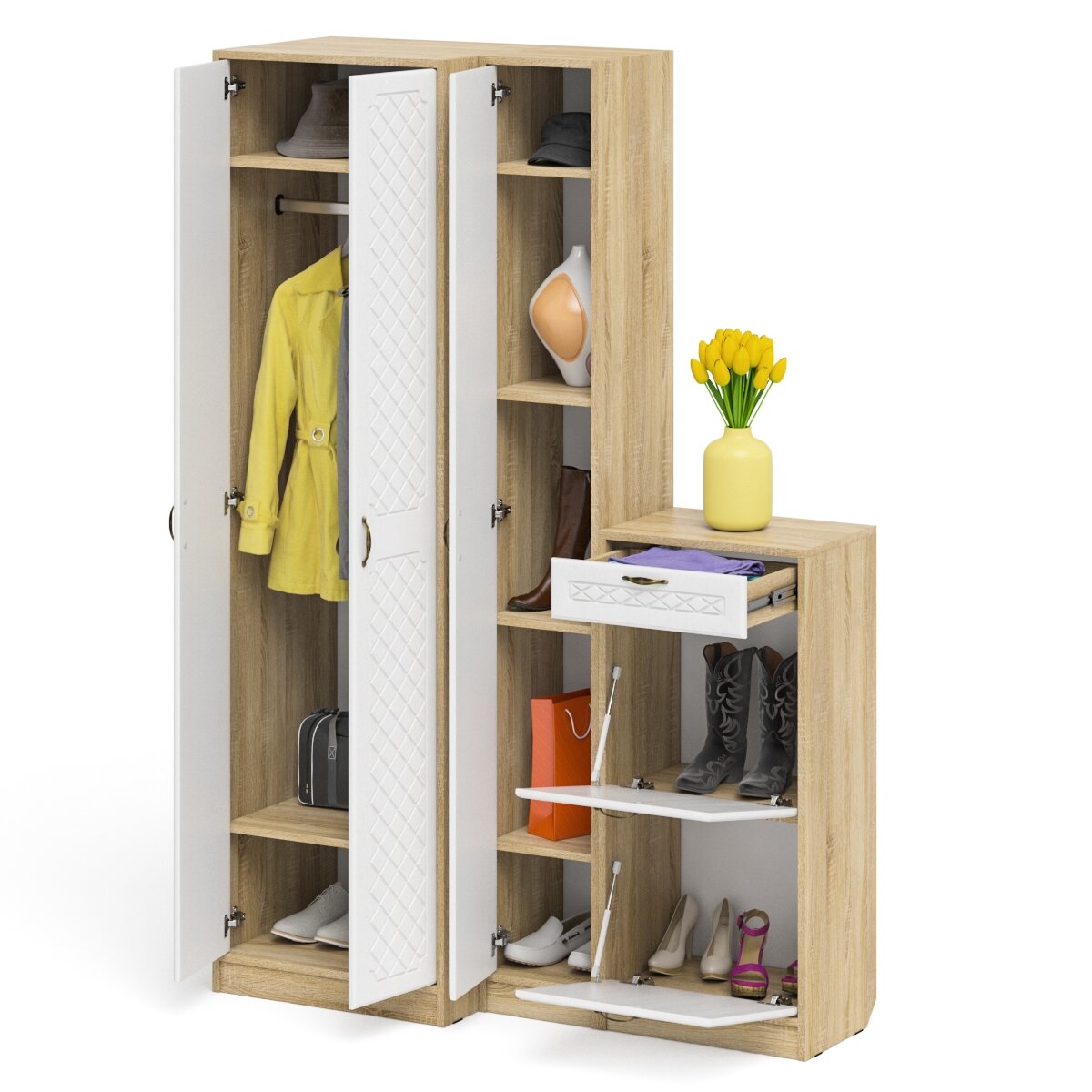 Обувница П-6 две секции с пеналом и шкафом, цвет дуб сонома/фасады МДФ белое дерево фрезеровка ромб, ШхГхВ 140х50х210 см., универсальная сборка
