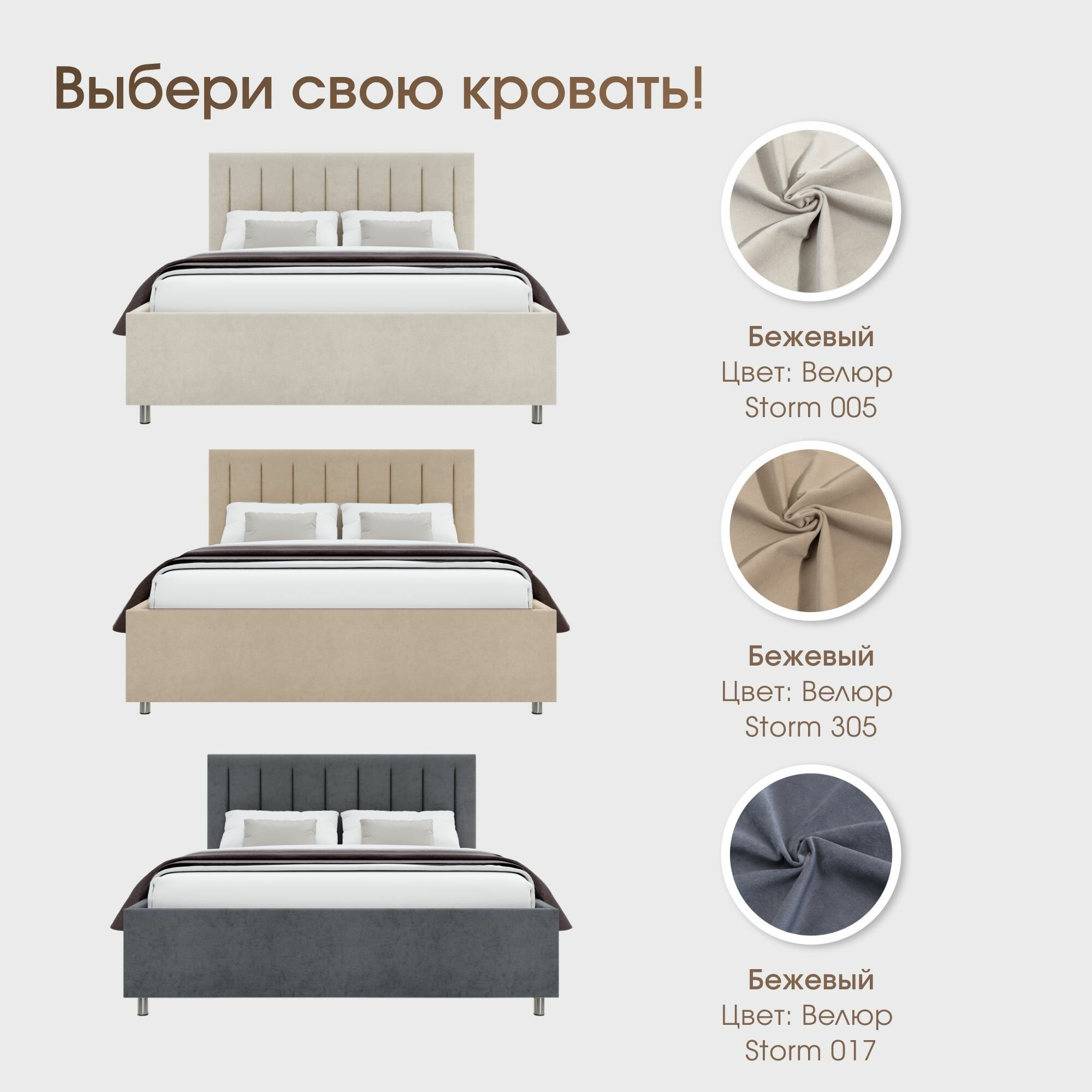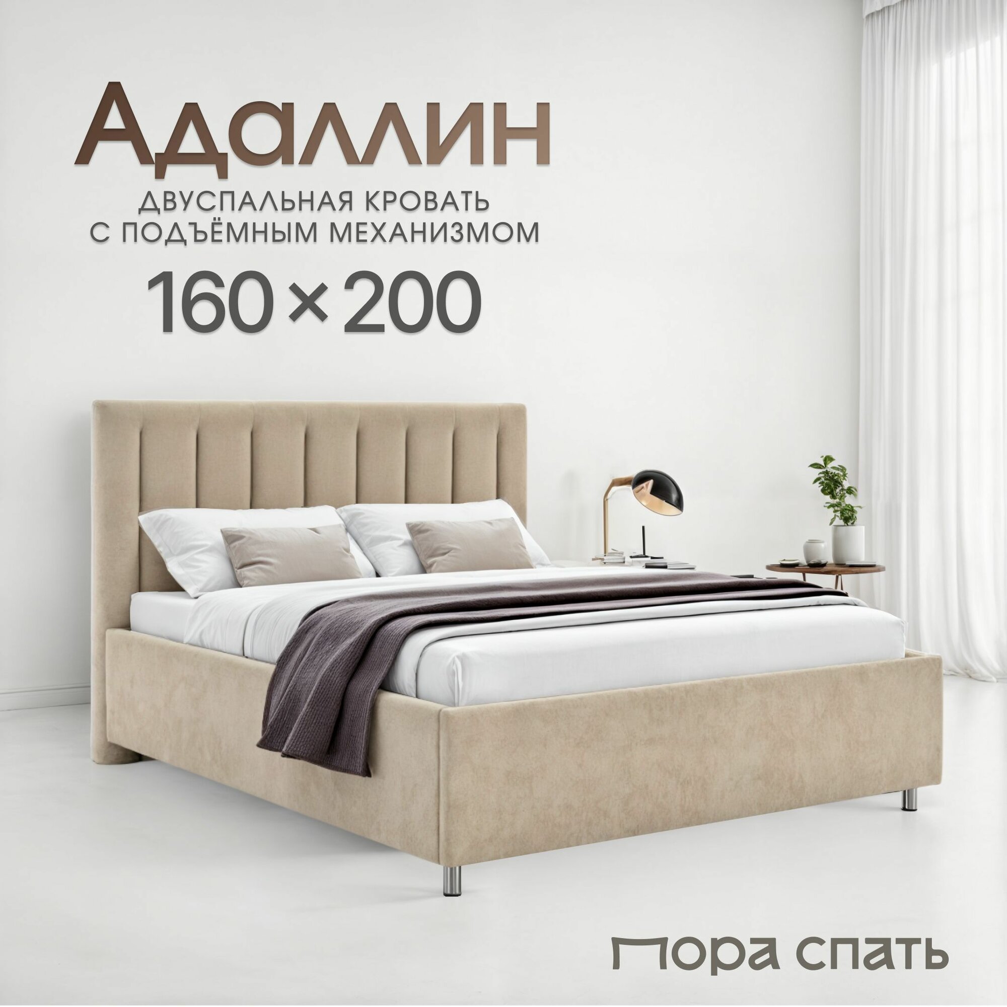 Кровать 160х200 с подъемным механизмом двуспальная Адаллин, с мягким изголовьем, для дома, для спальни, ортопедическое основание, ящик для белья, цвет Бежевый (теплый кремовый), Пора Спать информация: