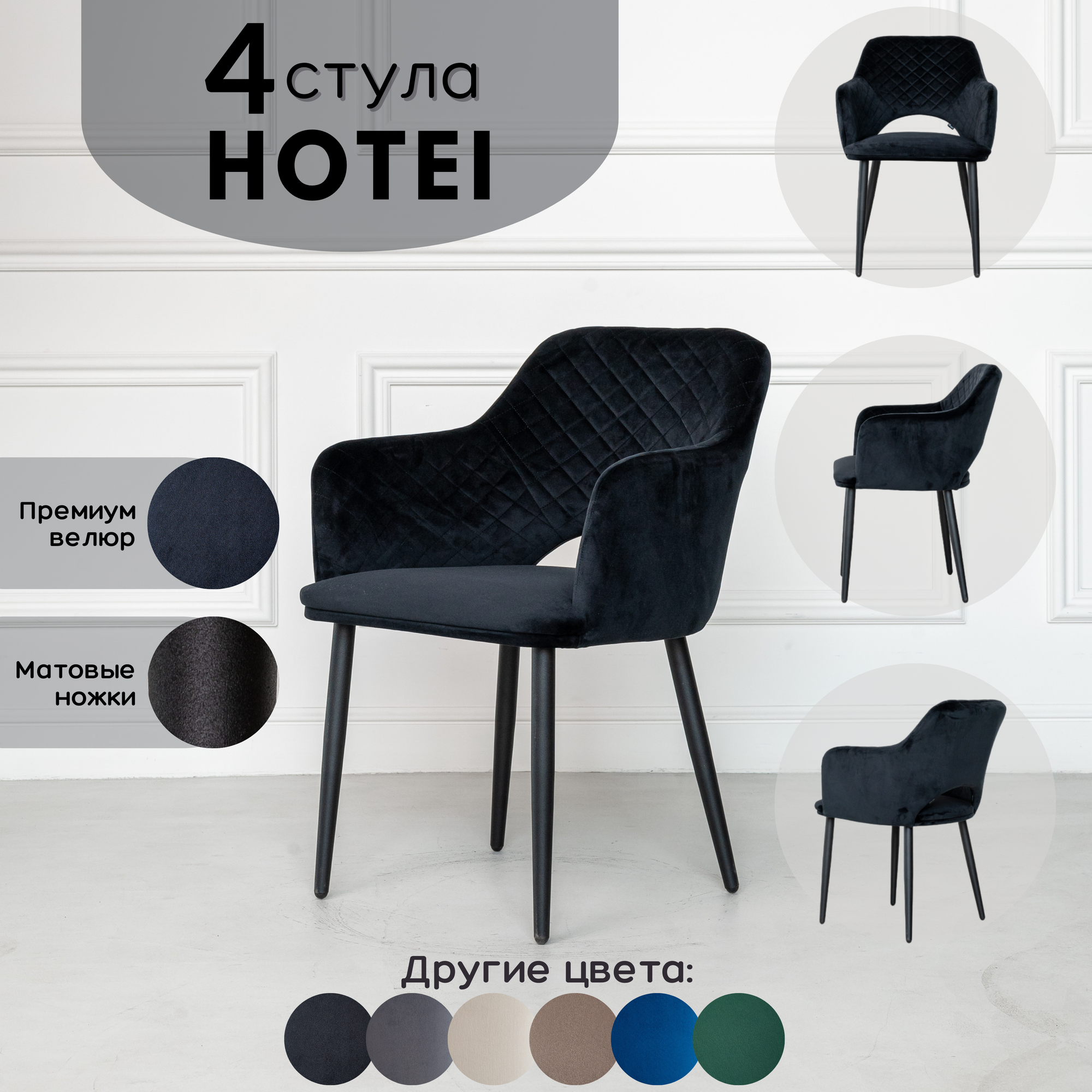 Стул кухонный Stuler chairs стул для кухни Hotei 4 шт, Комплект мягких стульев, Черный велюр черные матовые ножки 23 590 ₽