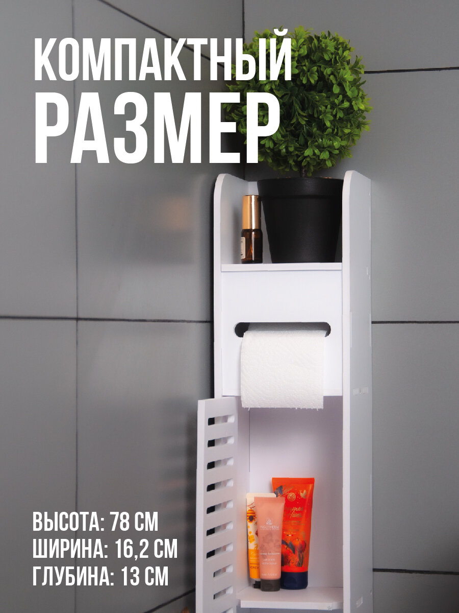 Шкаф-пенал для ванной и туалета белый напольный, узкая полка, держатель для туалетной бумаги информация: