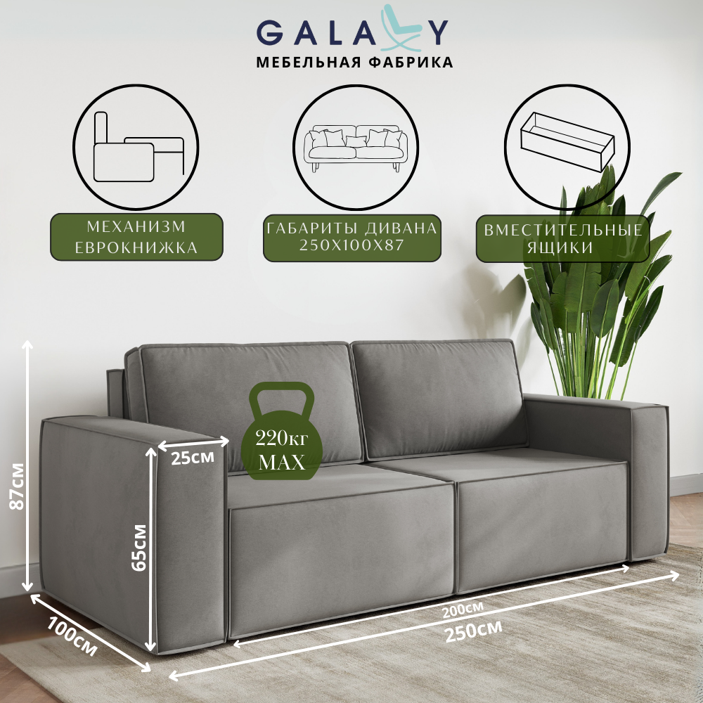 Прямой диван Лофт, со спальным местом 150х200см, для гостиной, с ящиком, механизм еврокнижка, велюр серый (Grey), GALAXY информация: