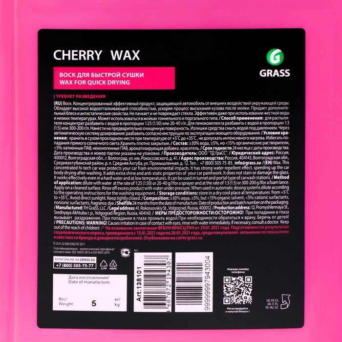 GRASS 138101 138101_холодный воск! ср-во спец.по уходу за автомобилем 'cherry wax' (канистра 5кг)\ 2 352 ₽