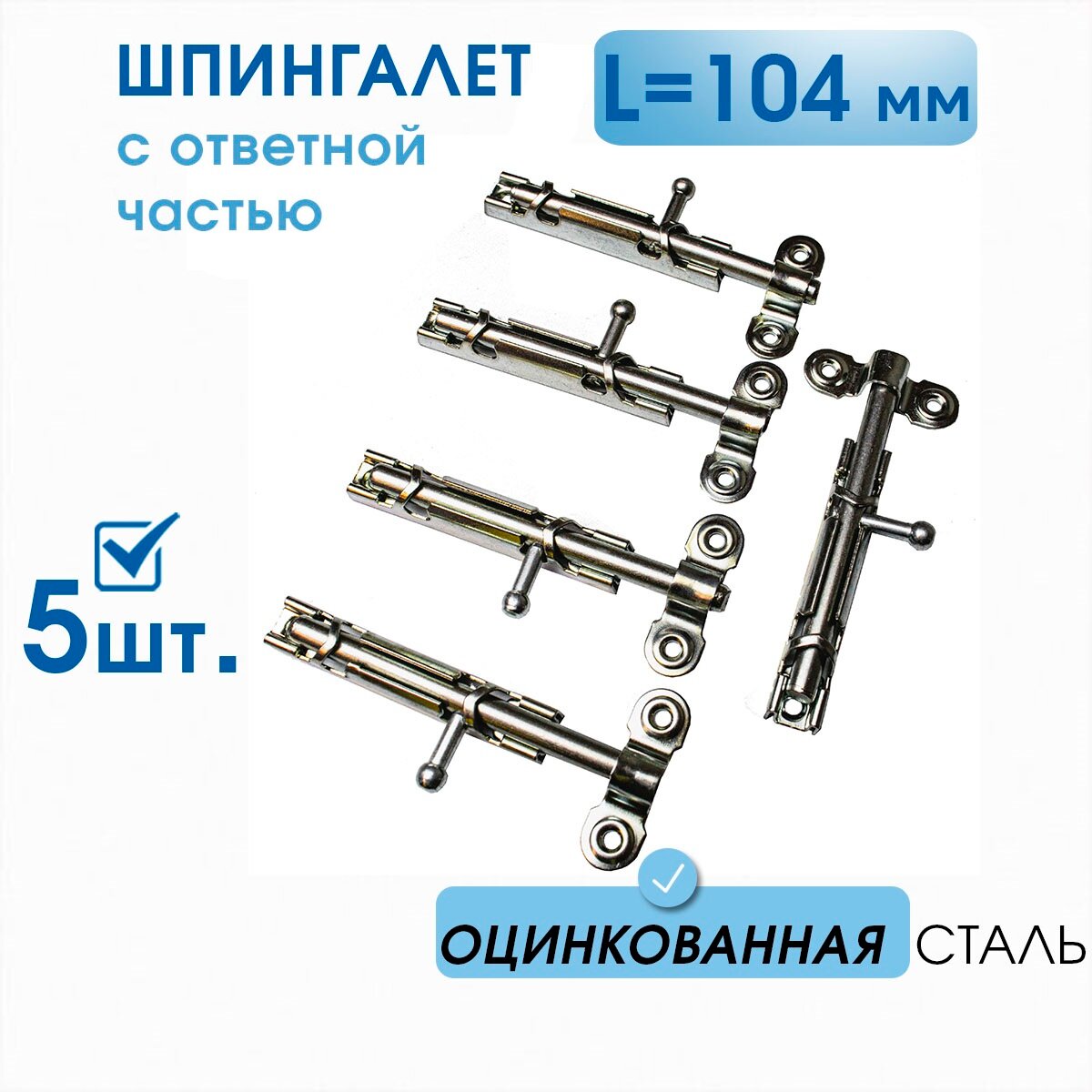 Шпингалет большой L-104 с ответной частью (5 шт), оцинк. сталь, задвижка на дверь накладная ЗТ-1 с цельным движком, щеколда для двери информация: