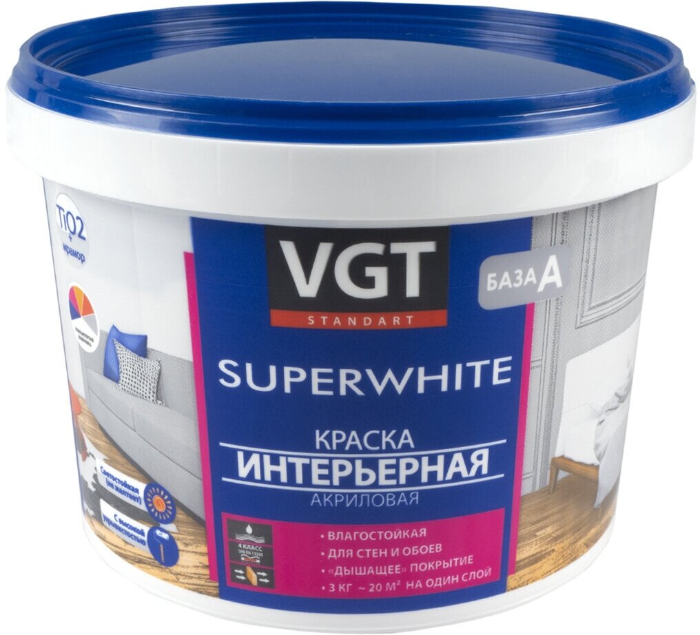 Краска акриловая интерьерная ВД-АК-2180 VGT Superwhite база A, белая, матовая (3кг)