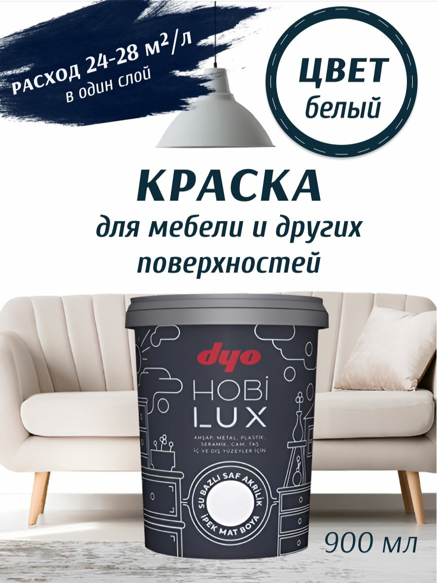 Краска "Dyo" шелковисто-матовая, для любых поверхностей "HOBILUX" цвет белый 0,9л информация: