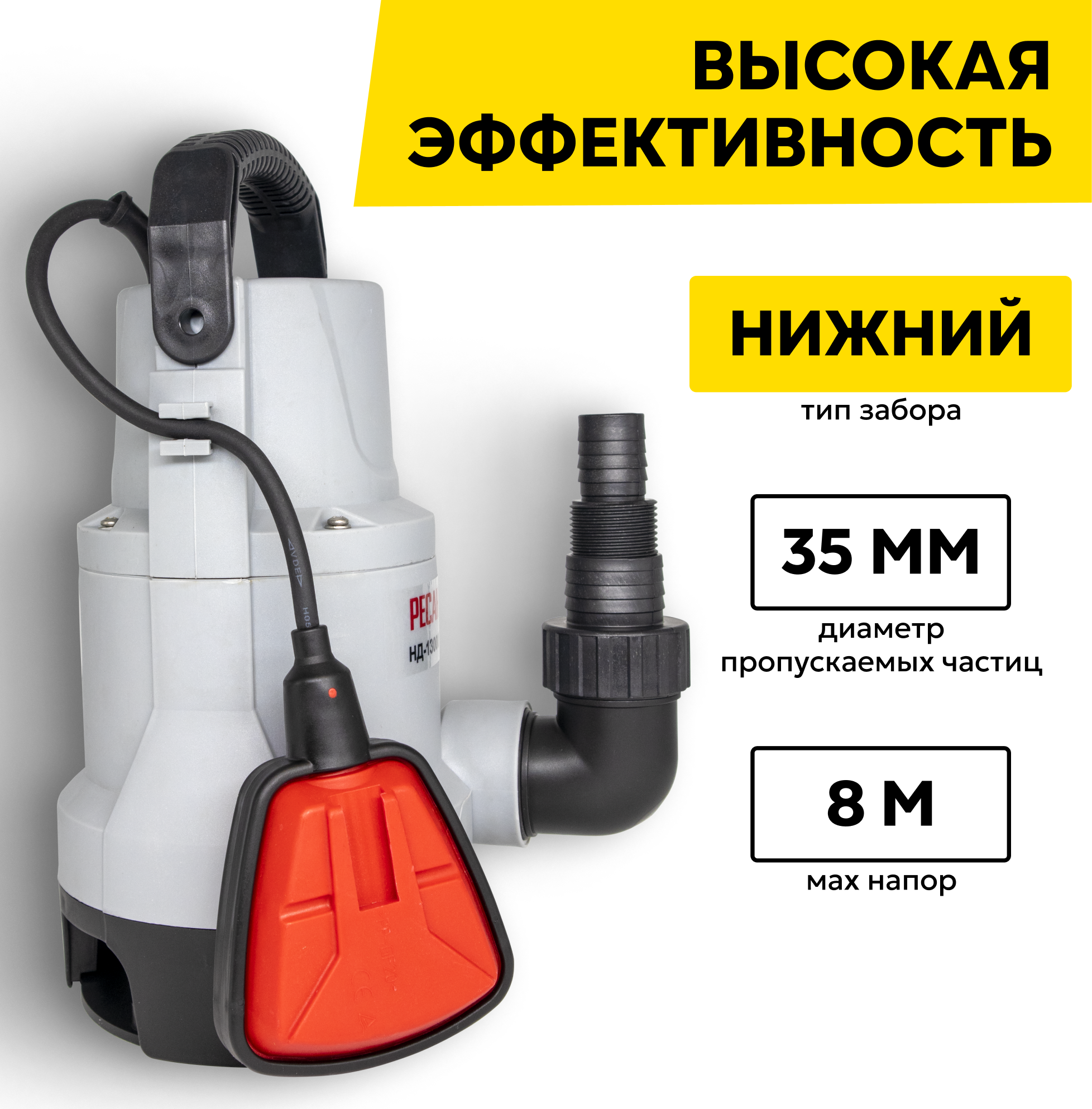 Дренажный насос Ресанта НД-13000П/35, 550 Вт, макс. напор – 8 м, 13000 л/час, для грязной воды информация: