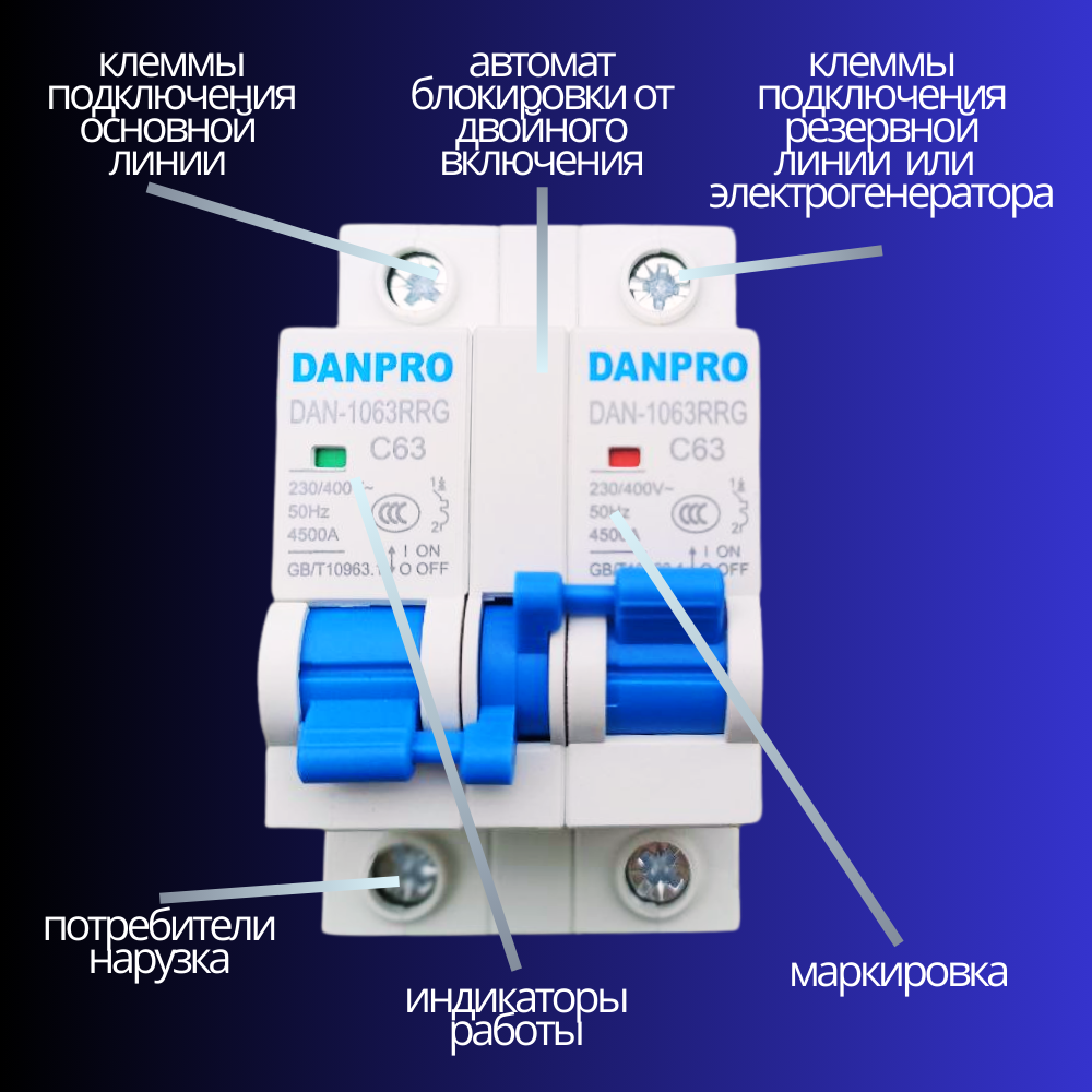 Рубильник реверсивный механический DANPRO, ручной ввод резерва генератора, однофазный 1P-1P на DIN рейку информация: