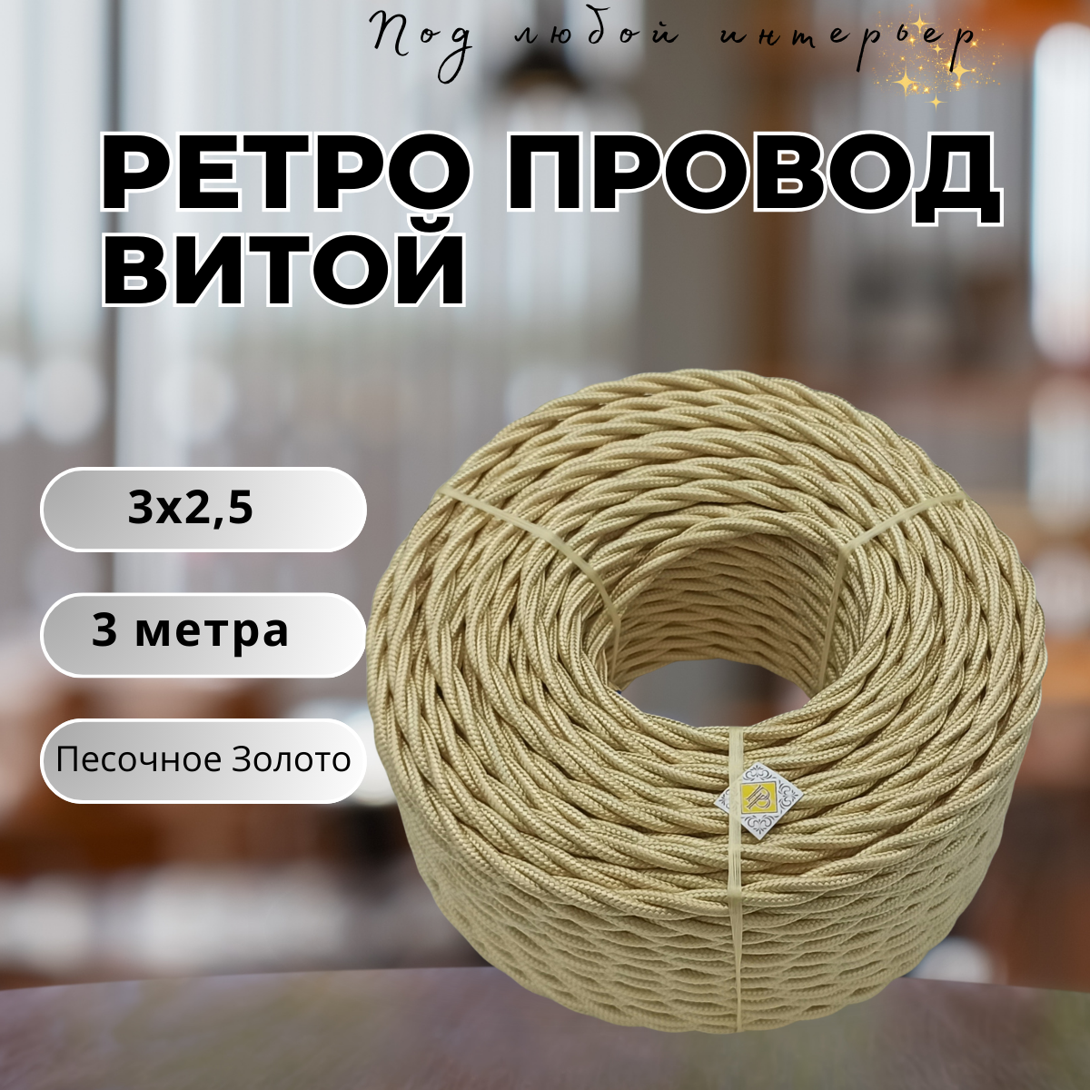 10 цен на Витой ретро провод BIRONI Бирони 3х2,5 матовый, 3 м/уп, B1-435-719-3 цвет: песочное золото