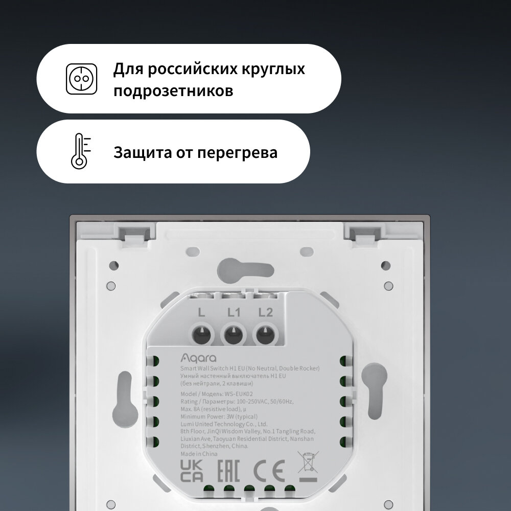 Умный выключатель двухклавишный без нейтрали Aqara H1 WS-EUK02gr, умный дом, серый информация: