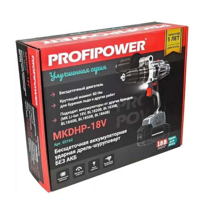 Дрель - шуруповерт PROFIPOWER MKDHP-18V ударная (бесщеточный, 18В, 80Нм, без АКБ и ЗУ) E0162 информация: