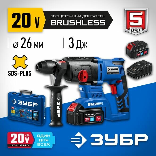 Бесщеточный перфоратор ЗУБР Т7, 20 В, 26 мм, 2 АКБ (4 Ач), кейс, Профессионал (PB-260-42) информация: