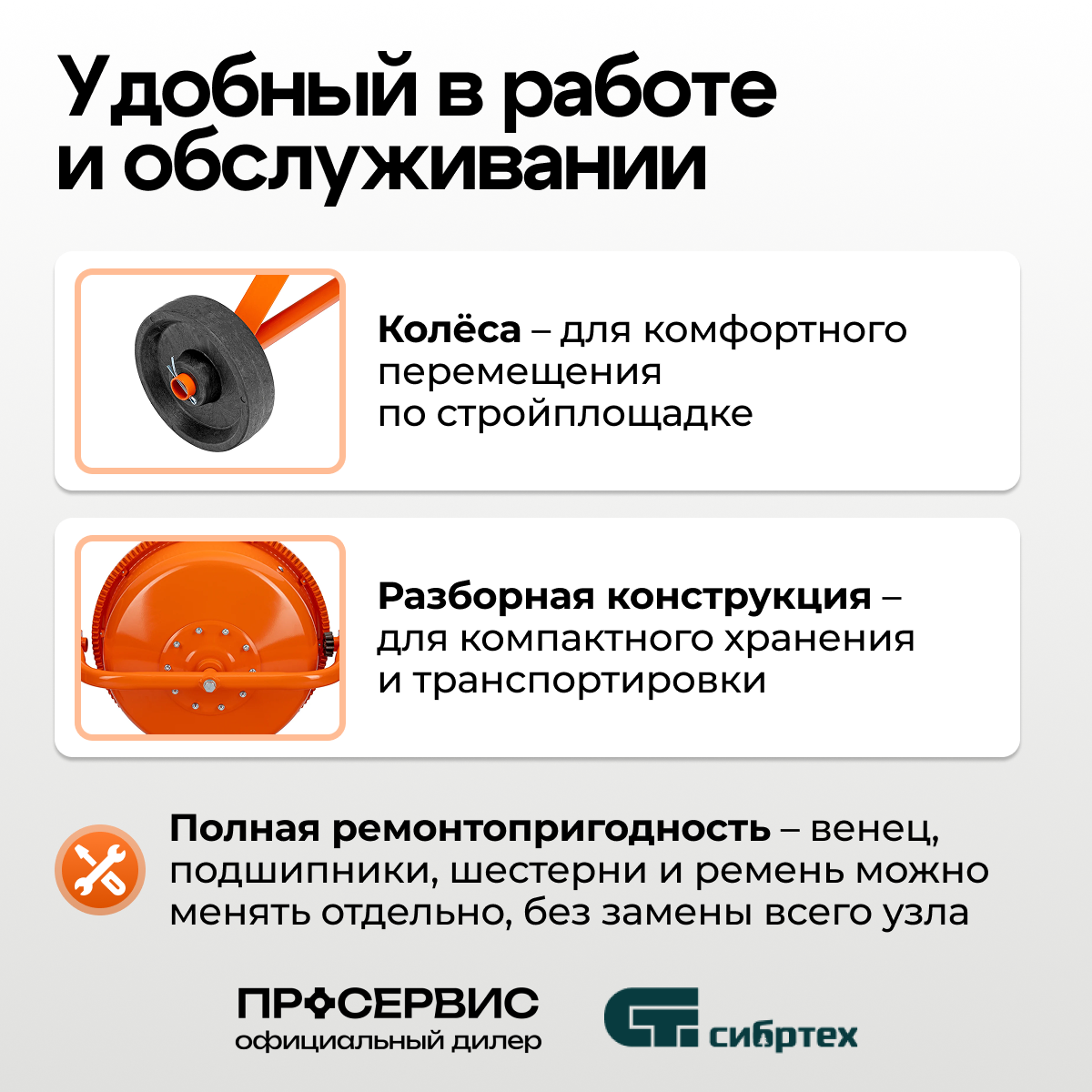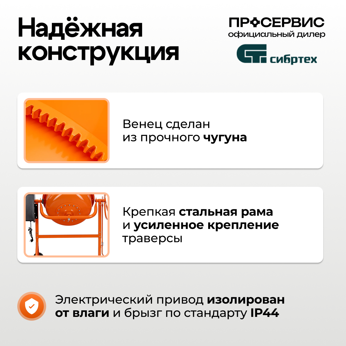 Бетоносмеситель СИБРТЕХ БСН-160, чугунный венец, 500Вт, 160л, 50л готового раствора информация: